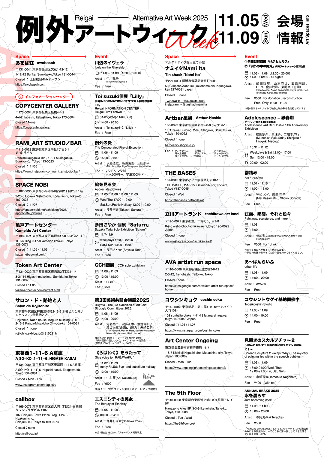 「例外アートウィーク」は、美術館やコマーシャルギャラリーとは一線を画し、独自の活動を行う小規模なアートスペースを紹介するWebサイト「例外アートスペース」が主催するスペシャルイベントです。 当ギャラリーは期間中、都内各所に点在する参加スペースの情報を集約するハブとなるとともに、来場者の皆様が東京のオルタナティブなアートシーンの「今」をより深く体感できる特別企画を実施します。