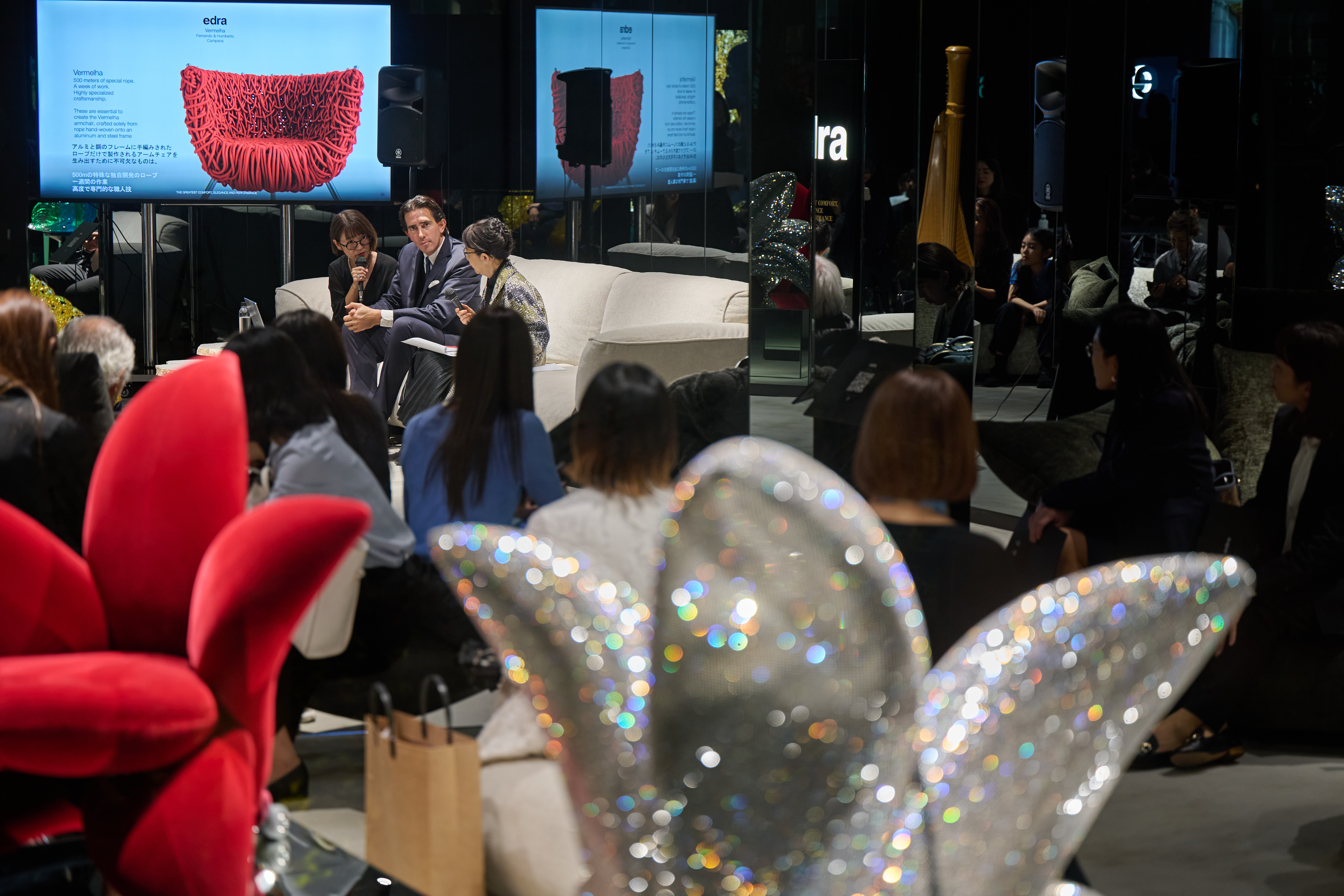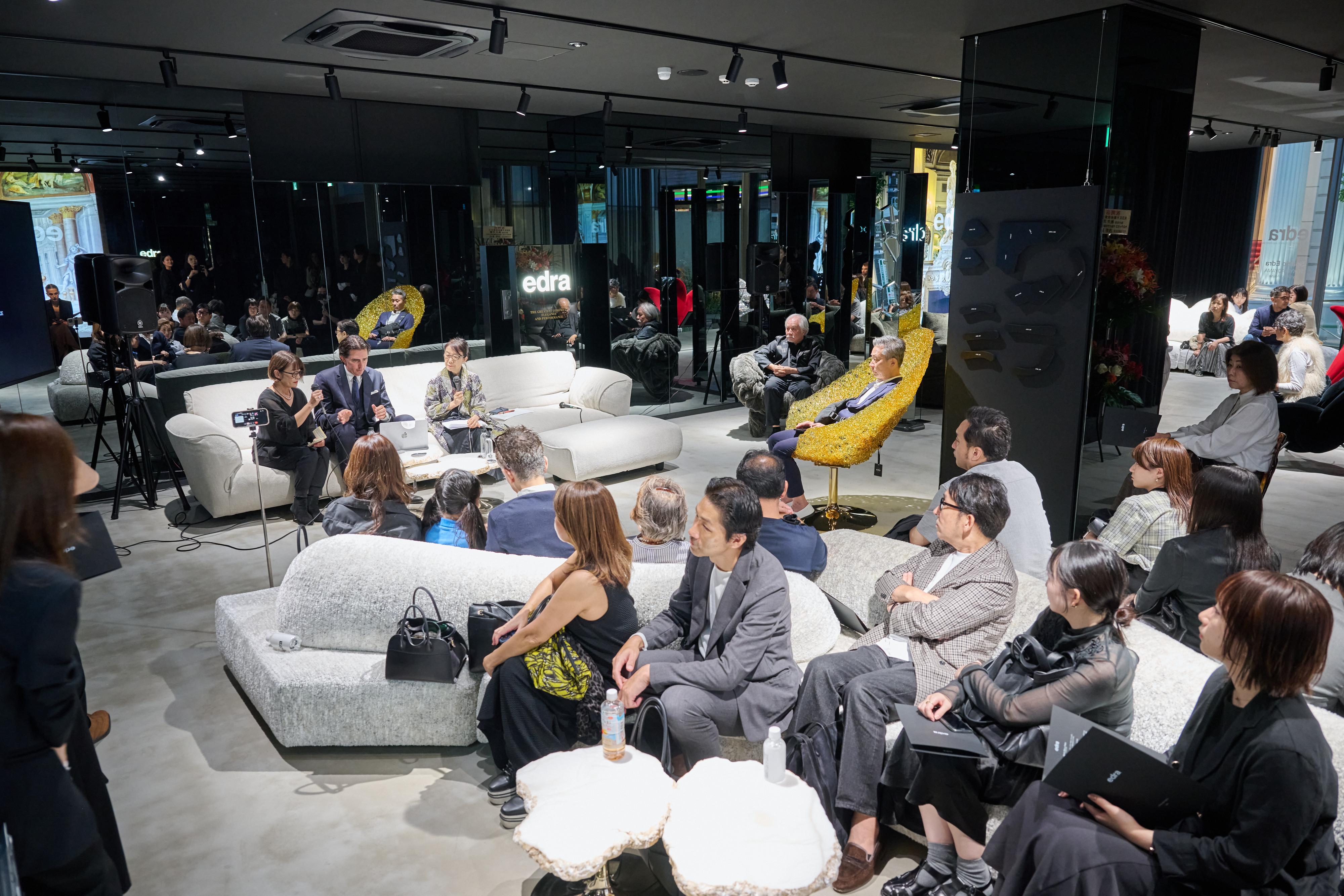 当日は、Edra本社のボードメンバーやジャンルイジ・ベネデッティ駐日イタリア大使を迎え、ブランドの哲学と世界観を五感で体感できる特別な時間を、300名を超える来場者にお届けしました。