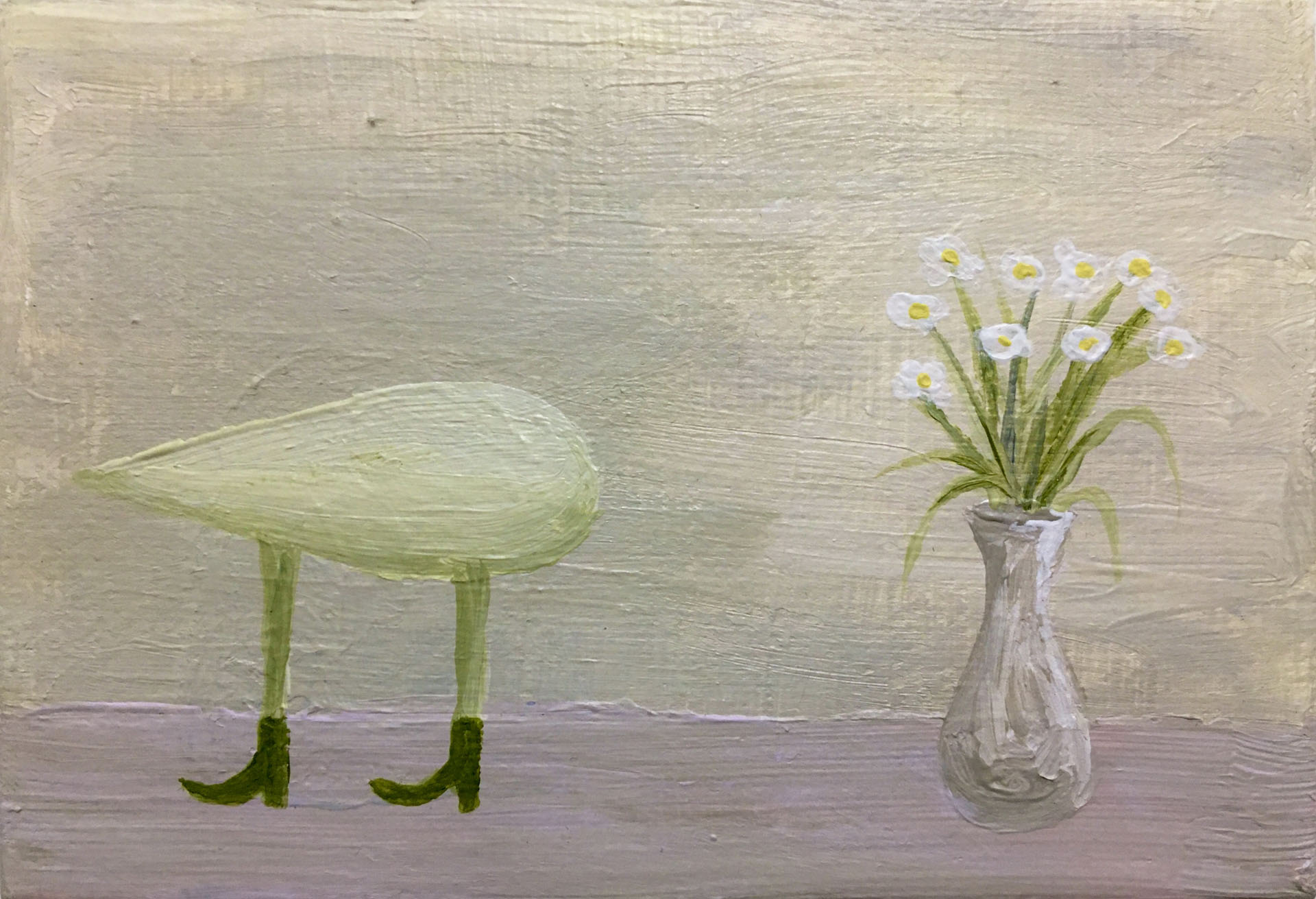 「ギャラリーやアートフェアで作品を発表し、活動してきて画家のようにふるまってはいるが、作るものは小学生の頃とさほど変わらない。今だに小学校の図工室にひとりでいるような気がしている。なんだか幽霊のようだ。この気分はネガティブではなく、ものを作る原点に立ち返る感覚である」