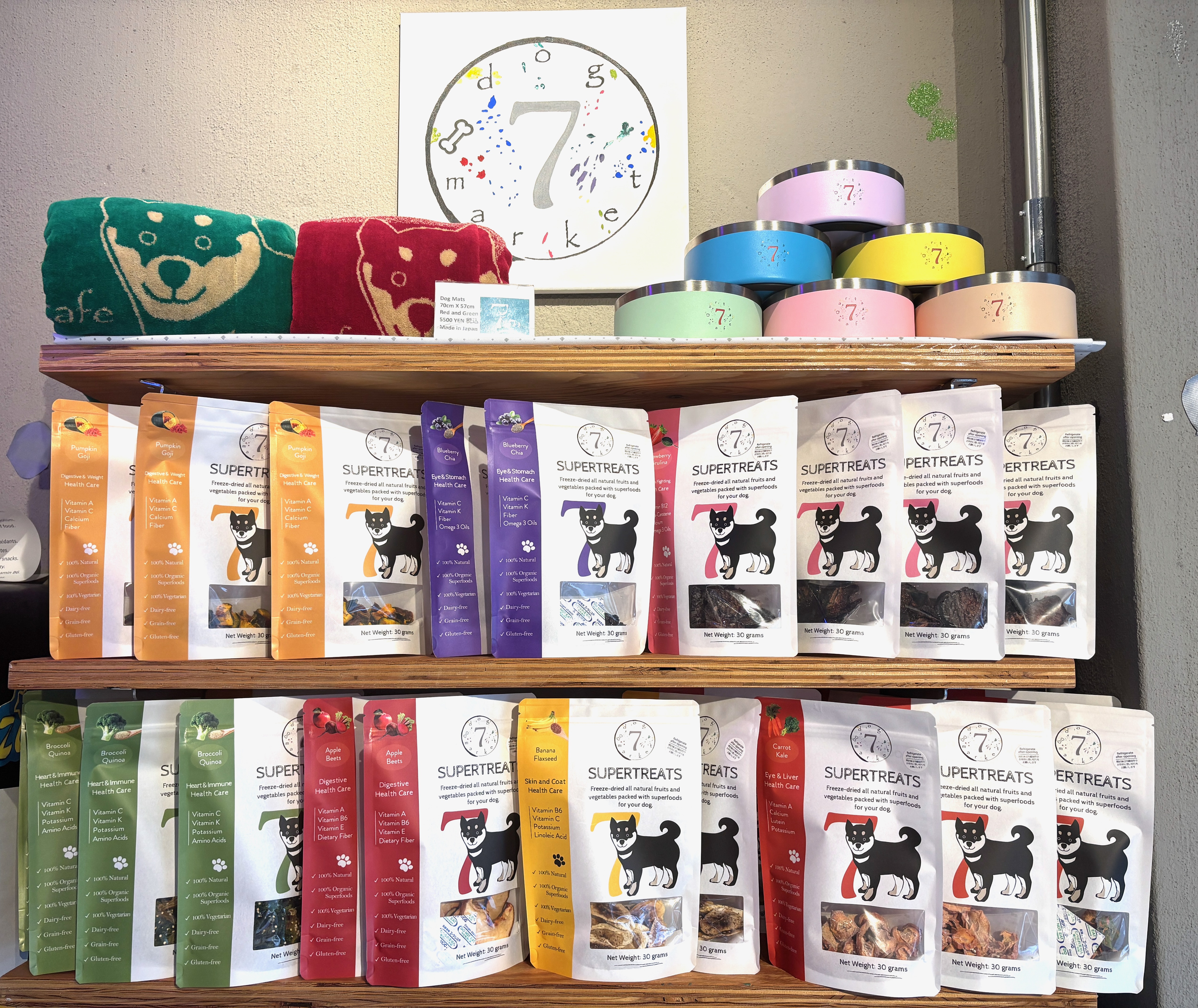 2023年発売。7dogmarketの新商品。犬向けスーパーフードを基にしたナチュラルトリーツは全7種類。