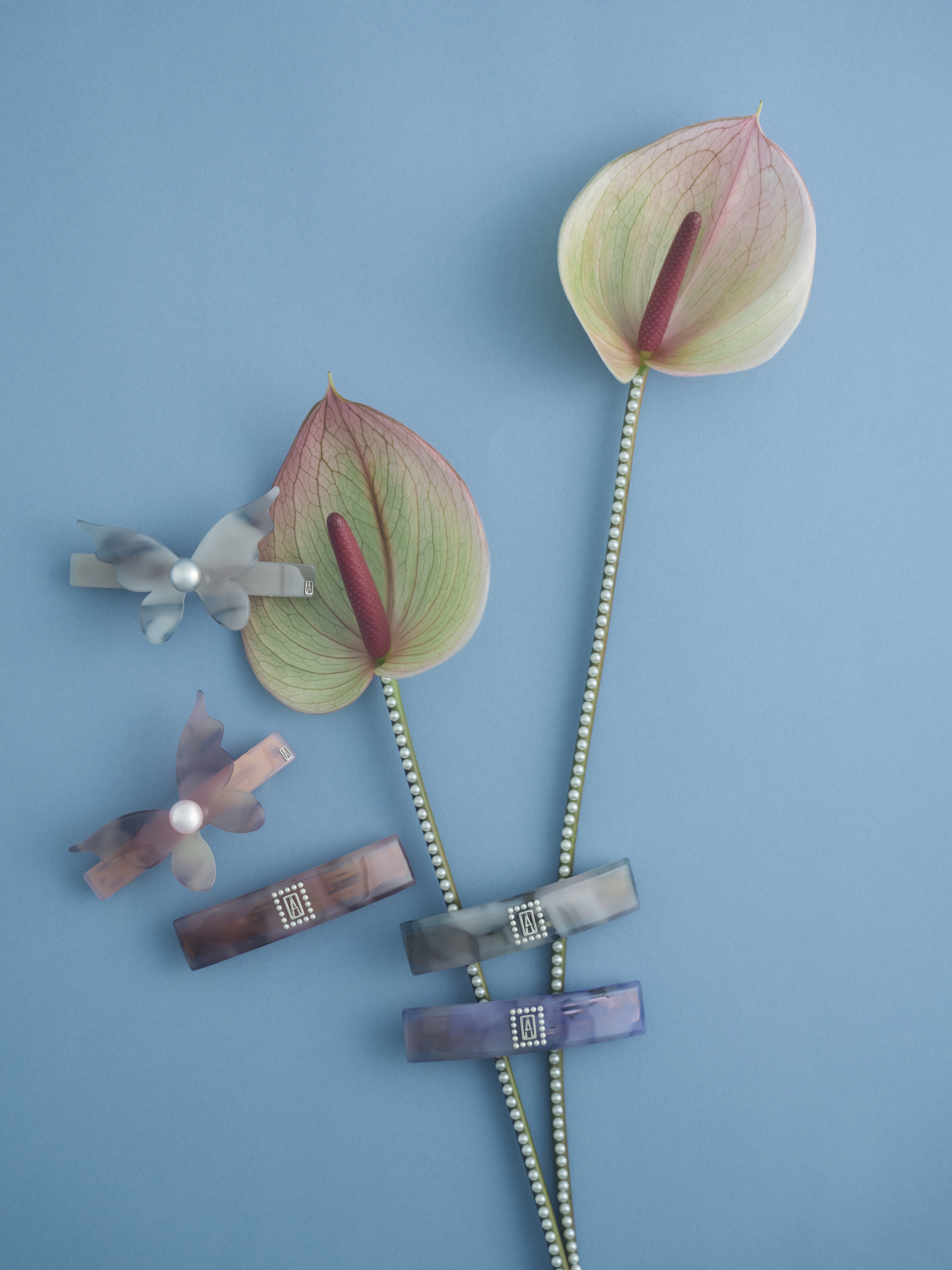 アセテートを重ねたリボンとアクセントのパールが立体的にセットされ可愛らしさの中に大人の気品を感じさせます。センターにはスワロフスキー®・クリスタルが煌めき、ヘアアレンジに華やかさをプラスしてくれます。バラ、ライラック、そして繊細なグレートーンの柔らかく女性的な色調のパレットで作られたヘアアクセサリーは、自然と都市生活のつかの間の瞬間を捉えたモネの卓越した技巧を繊細に表現しています。