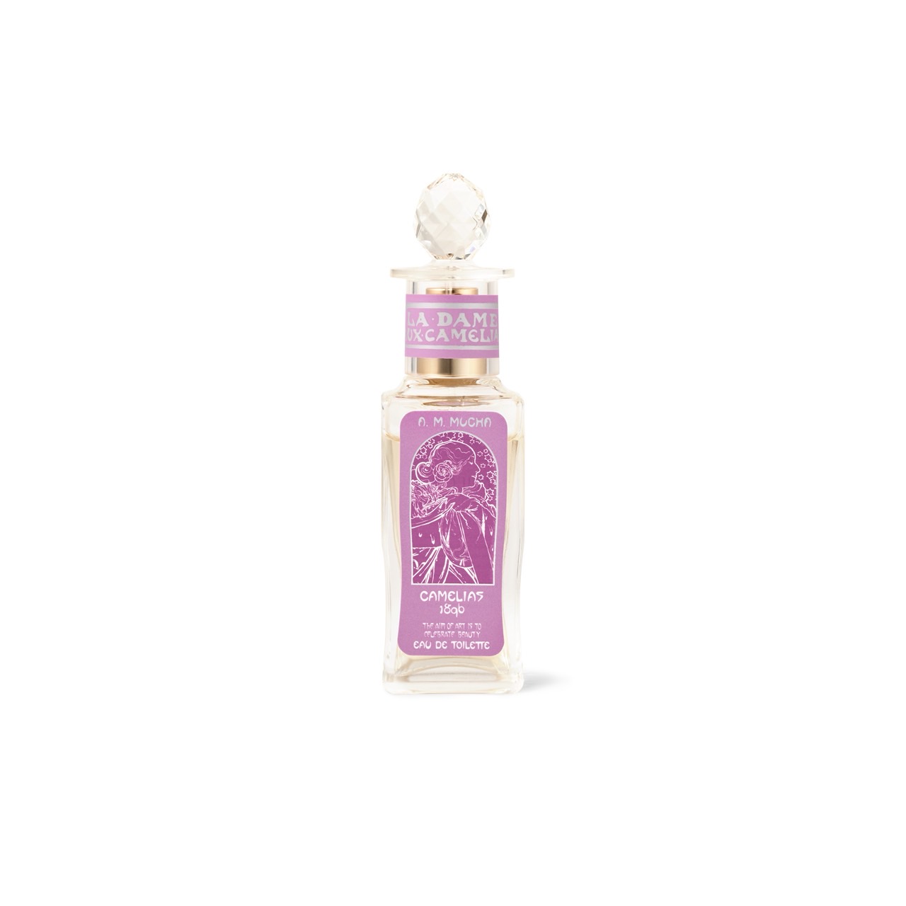 元々は香りを持たない花・カメリアも、ミュシャの描く世界では芳醇なアンバリーフローラルに匂い立ちます。ベルガモットとマンダリンの軽やかなトップノートを束ねるのはイランイランのビターな甘み。そこから次々と浮かび上がるオリエンタルなジャスミン、アイリスにラベンダーは、一夜の夢を思わせるはかない幸福感に満ち足りて。秘められた椿姫の情熱が、私たちをいつもより少しだけ大胆にさせます。目覚めを促すのは、ムスクやトンカビーン、サンダルウッドが織りなすメロウなアンバーウッド。現(うつつ)でもひたむきな愛のちからで、恋する誰かの背中を後押しします。