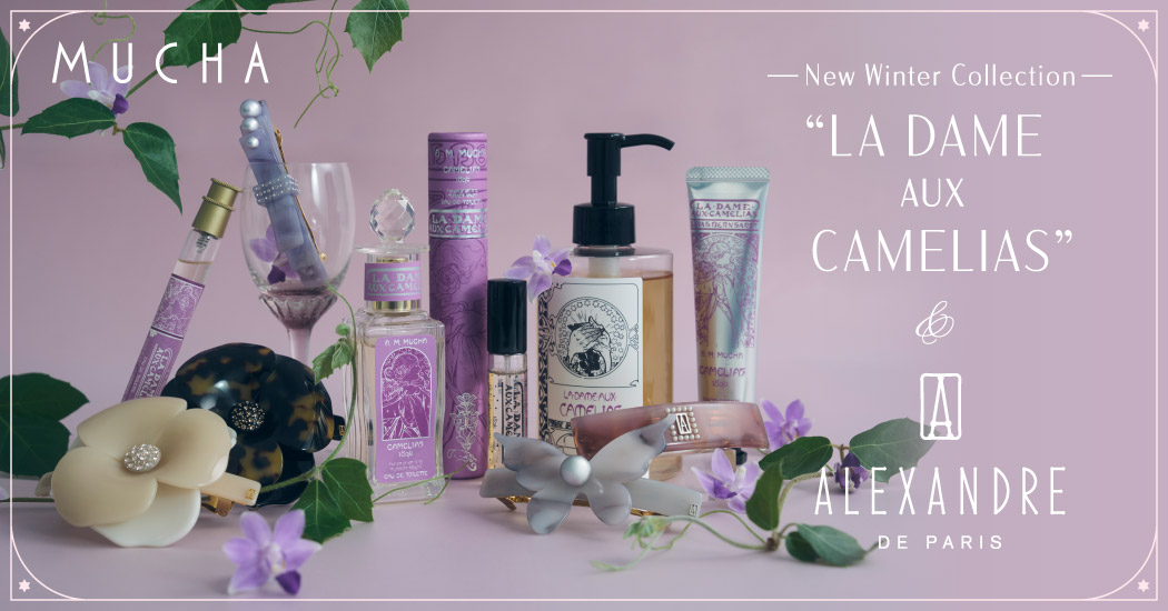 ホーム商品サービス【MUCHA(ミュシャ)】作品『椿姫』がモチーフの人気フレグランス「カメリア」がボトルデザインをリニューアルして登場!〈アレクサンドル ドゥ パリ〉より椿の花をテーマにしたスペシャルアイテムも同時発売