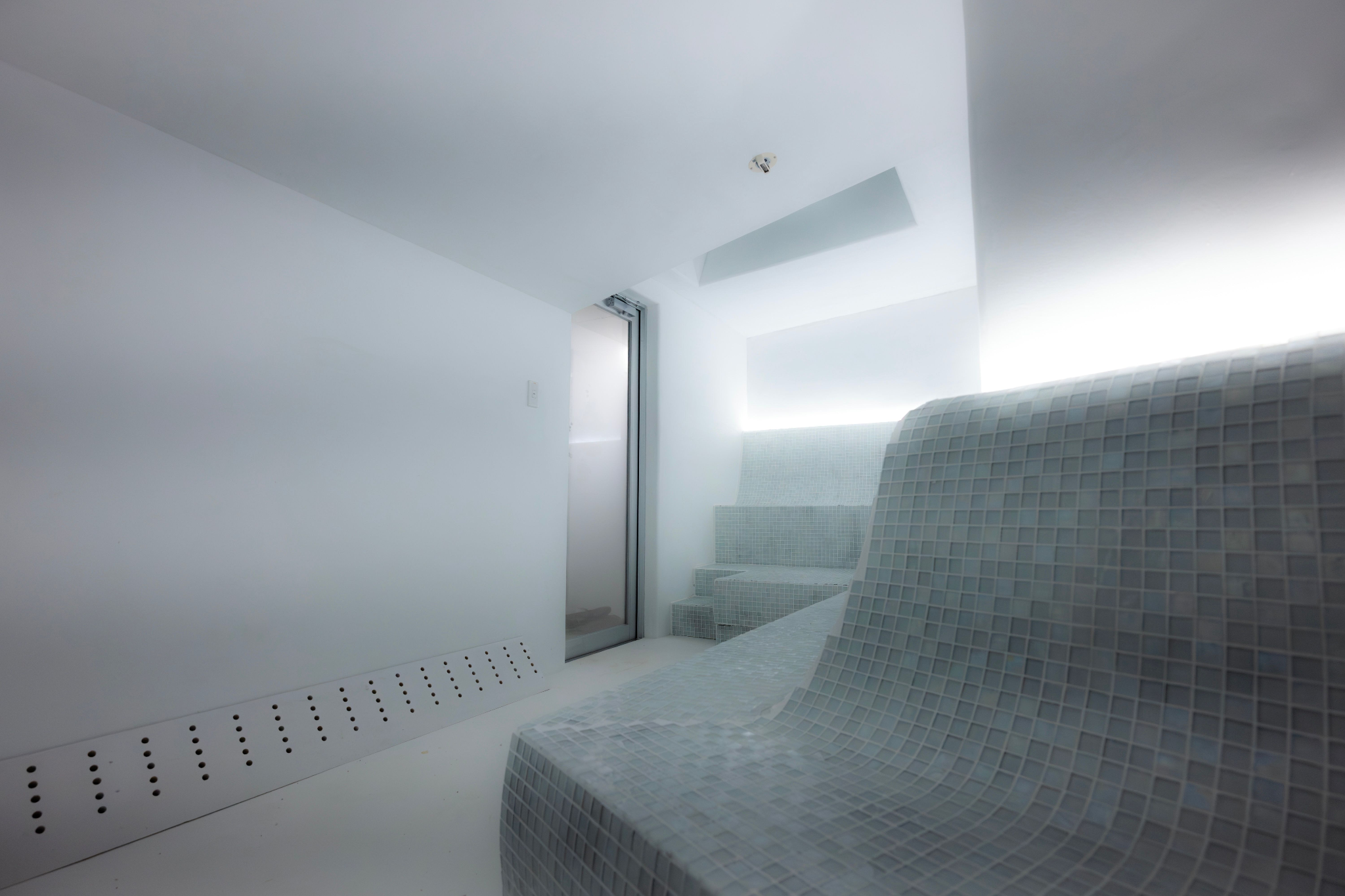 薬草スチームサウナ(女性):既存の女性スチームサウナを増設し、白を基調とした柔らかな空間。