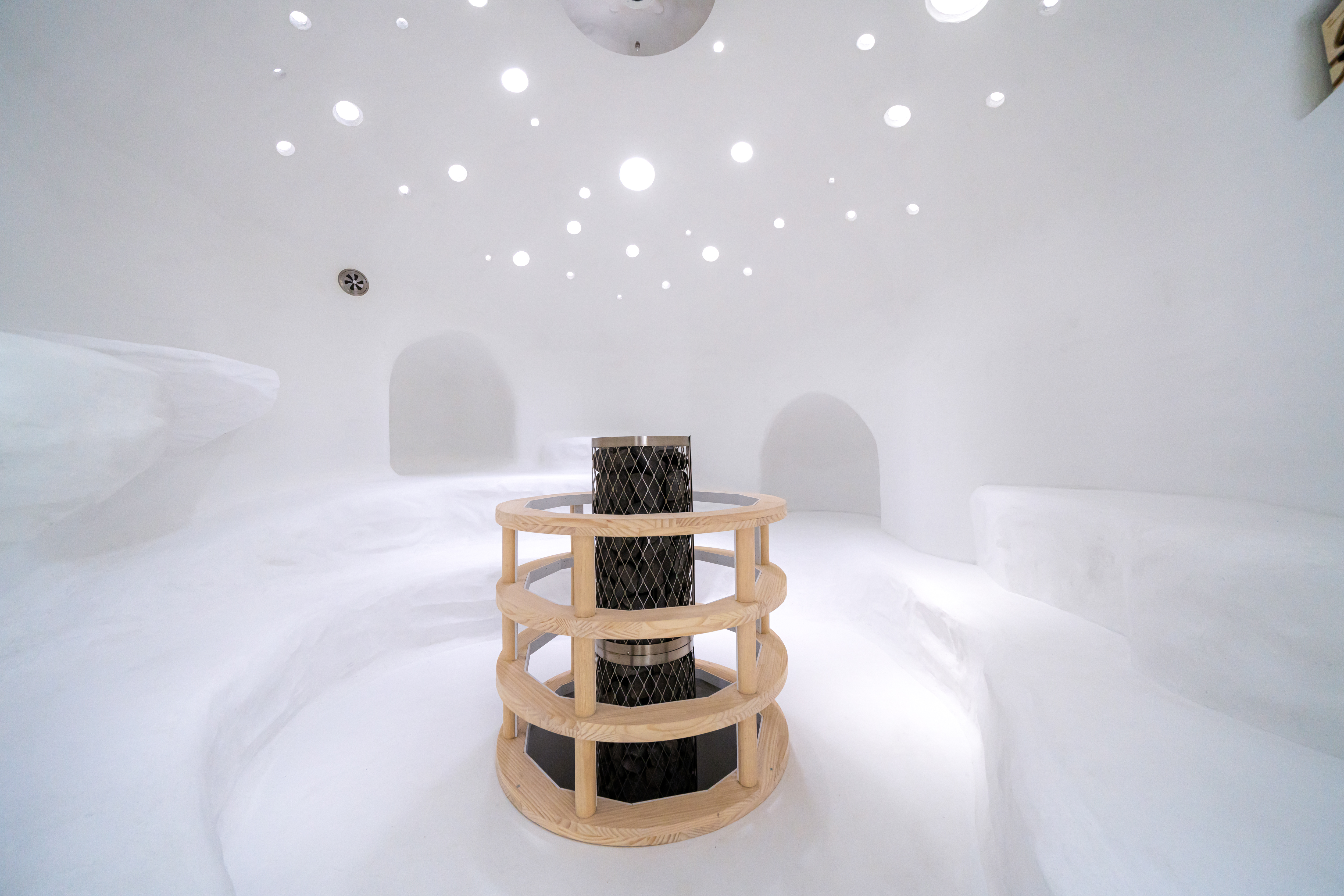 「女性 ドライサウナ」サウナストーブに積み上げているサウナストーンの上に、キューゲル(アロマ氷)を乗せ1~2分経つと、キューゲルが溶け出し、サウナ室がアロマの香りに包まれます。