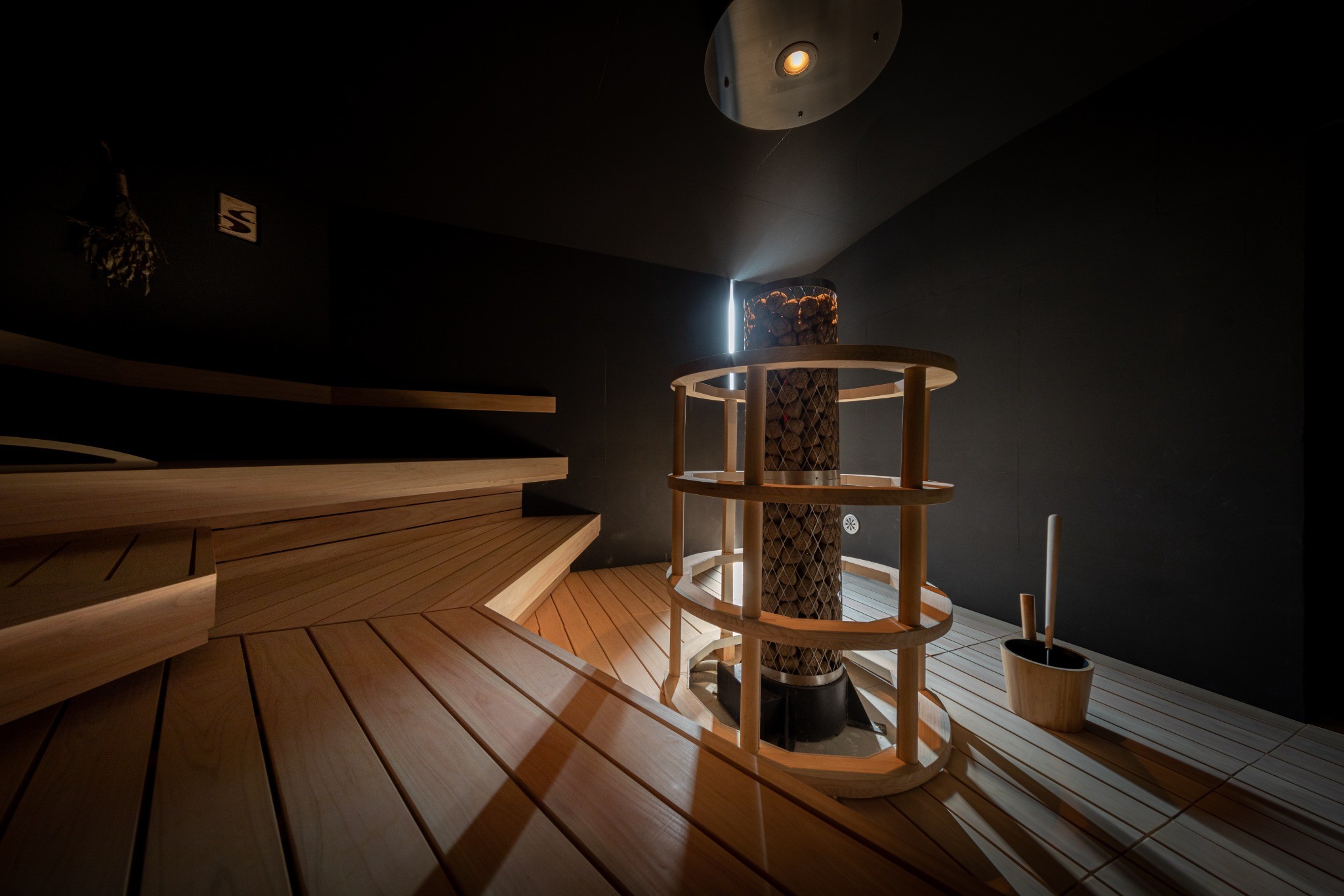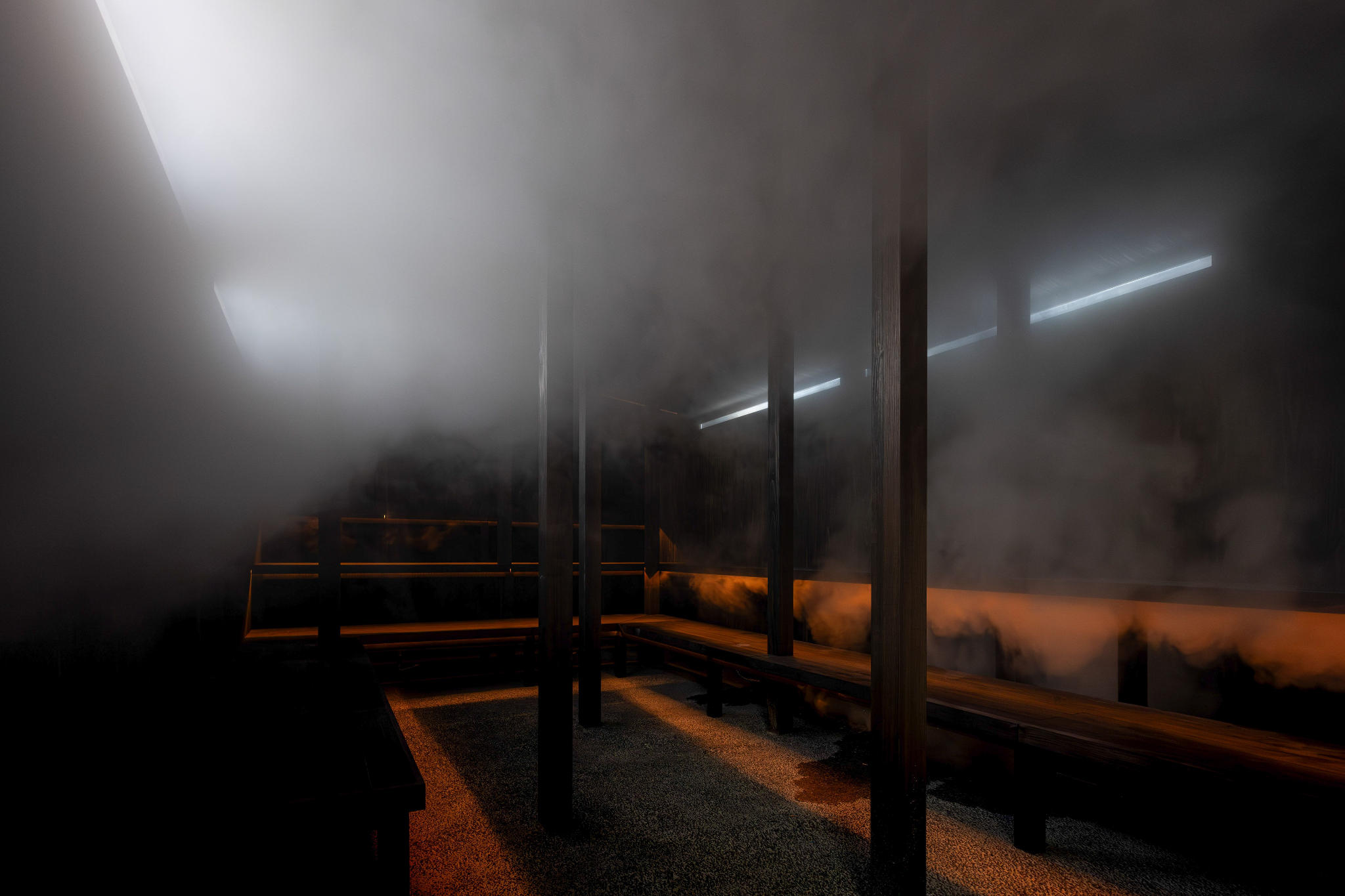薬草スチームサウナ(男性):黒を基調としたシンプルなつくり。薬草の蒸気と壁面から差し込む太陽光、夜は最小限のライティングで幻想的な空間を演出。