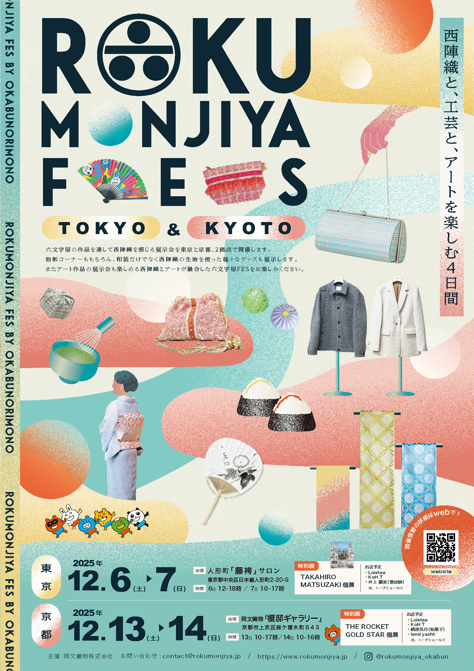 2025年12月、1690年創業の西陣織織元・六文字屋を運営する岡文織物株式会社(本社:京都市上京区、代表取締役社長:岡本夏樹)は、西陣織とアートが融合する新しい西陣織体験を提案するイベント 「ROKUMONJIYA FES」 を東京と京都の2会場で開催いたします。西陣織ブランド「六文字屋」の作品展示を中心に、アート・ファッション・雑貨など、複数の出展者が集い西陣織と文化を楽しむイベントです。
