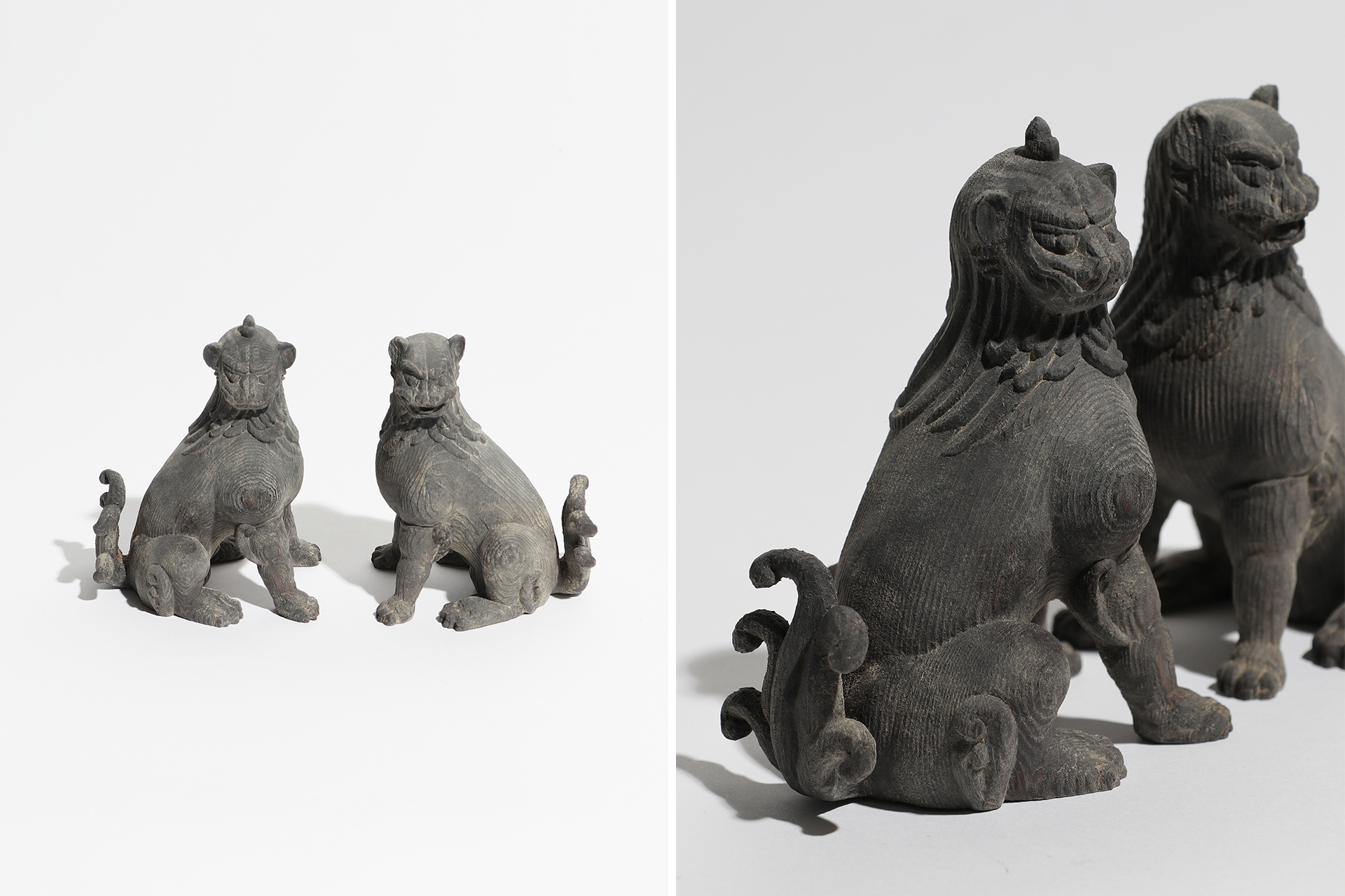像から生まれた作品。 強そうでありながら、どこか滑稽な日本の獅子・狛犬の姿を彫