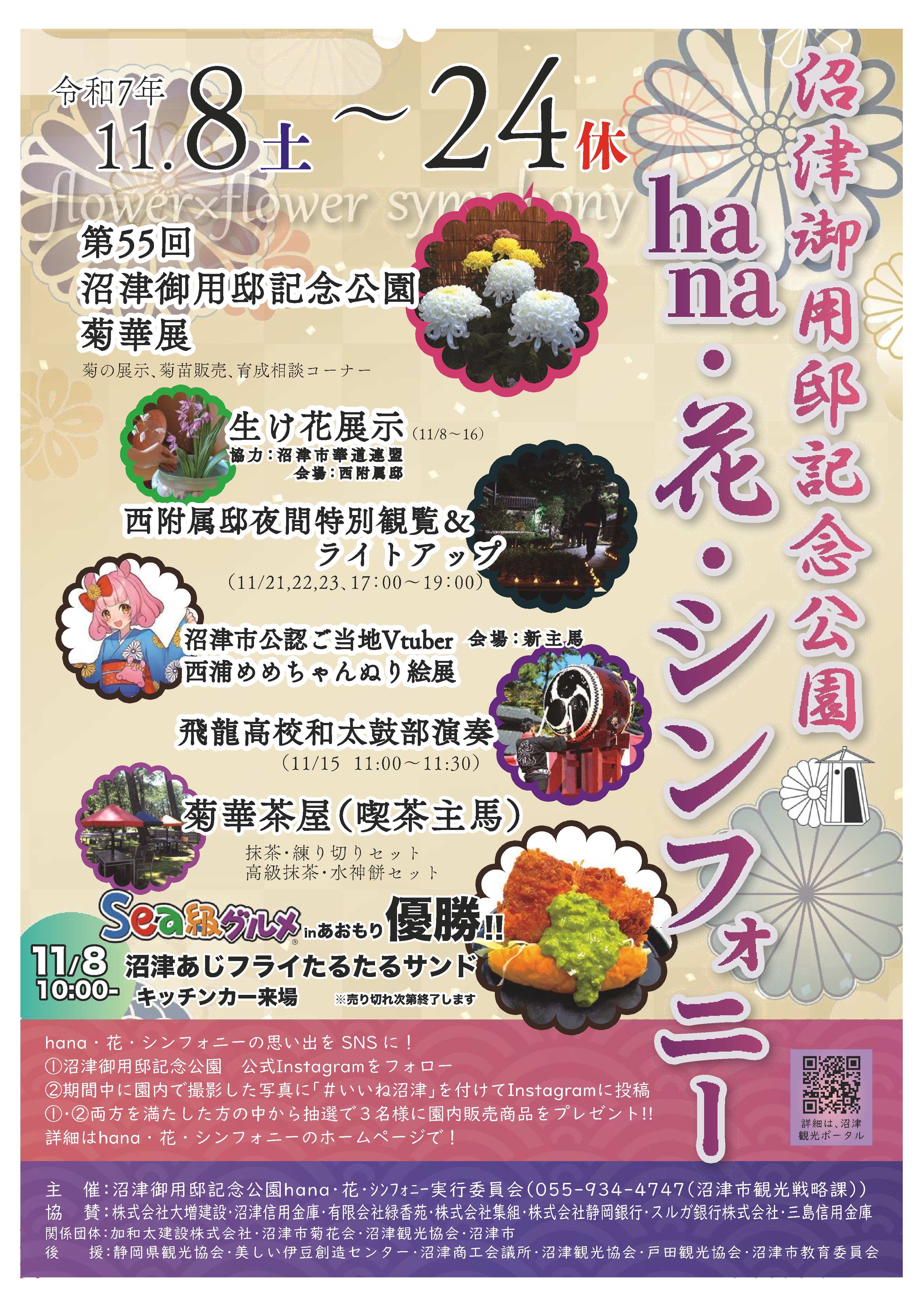 沼津御用邸記念公園にて、菊華展を中心とした花の祭典が開催中です。以前の開催で好評だった、竹のインスタレーションアートや夜間ライトアップ、今年9月に青森で開催された「第16回みなとオアシスSea級グルメ全国大会inあおもり」で優勝した沼津あじフライたるたるサンドのキッチンカーも出店します!(売り切れ次第終了)