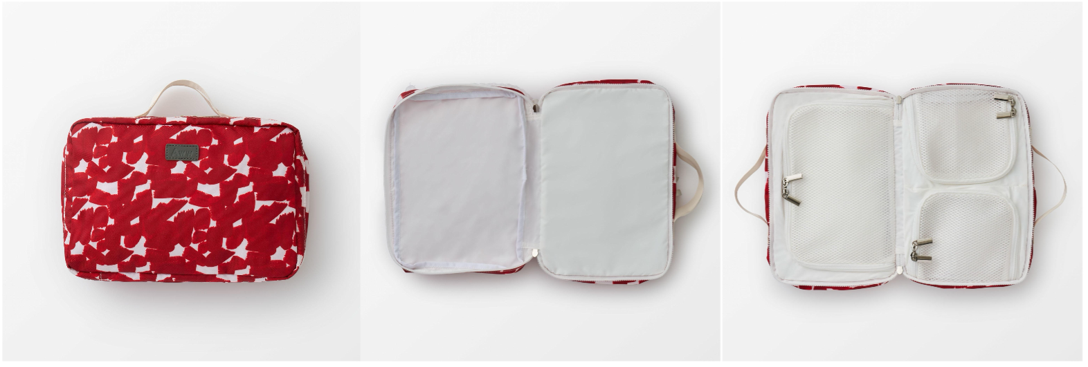 下着や靴下、化粧品や洗面用具などを細かく整理して持ち運べるよう前面・背面に分かれ、背面には3つのメッシュポケットを配置。手持ちハンドル付きで、旅先のバスルームやサウナバッグとしても便利です。素材には、環境に優しいリサイクルポリエステルを使用しています。