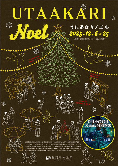 ⻑⾨湯本温泉では、温泉街を流れる⾳信川(おとずれがわ)を舞台に、⻑⾨市出⾝の童謡詩⼈「⾦⼦みすゞ」の詩をテーマにした灯りのイベント「⾳信川うたあかり」を開催しています。