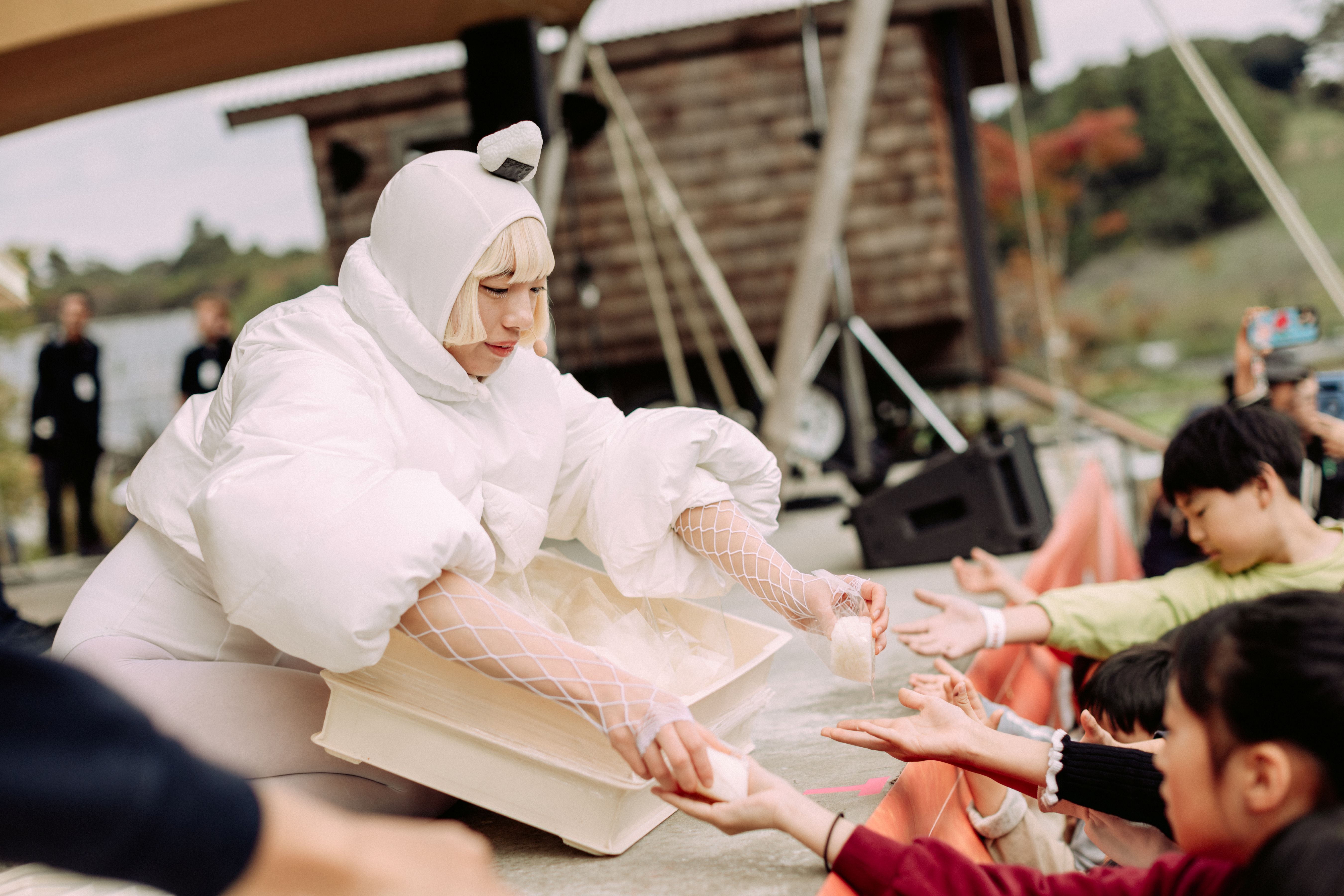来場者に地元の新米で握ったおにぎり各日500個を振る舞い、お米作りに関わった全ての人への感謝を込めて乾杯するパフォーマンス「おにぎりで1000人とつながろう」では会場が一体となり、現代美術家・淺井裕介さんと共に、園内の道に描き出すアート制作体験を通じ、生き生きとした野菜の白線素材が刻みつけられました。鶏やサーモンが美味しい料理になるまでの一連を知り、「いただきます」の本当の意味を考えるワークショップは両日とも満席に。開墾中の棚田では収穫されるお米の将来を考える「投票所」が出現しました。