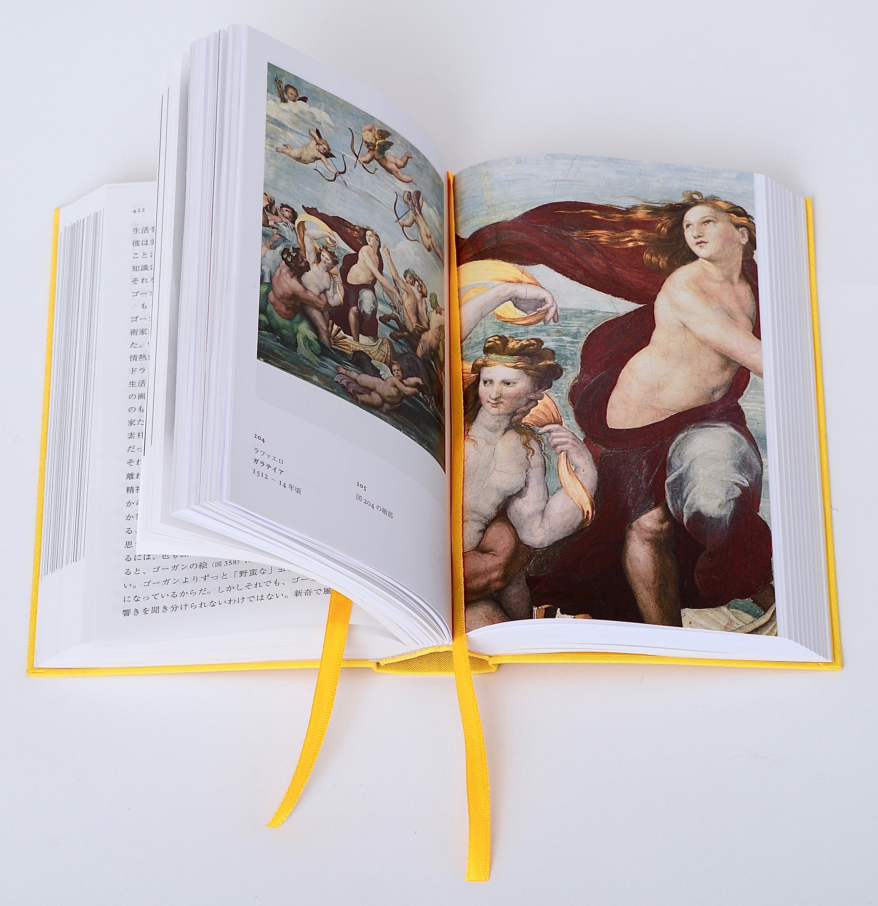 このため、テキストと図版とを交互に見ながら読み進めることができるように、しおり紐を「ポケット版」では特別に2本セット。テキストページ内で記される図版ナンバーで図版にあたることができますので、1本はテキストページに、1本は図版ページに使用することで、容易に双方を行き来することができます。しおり紐は表紙のクロスと同色の鮮やかな黄色です。