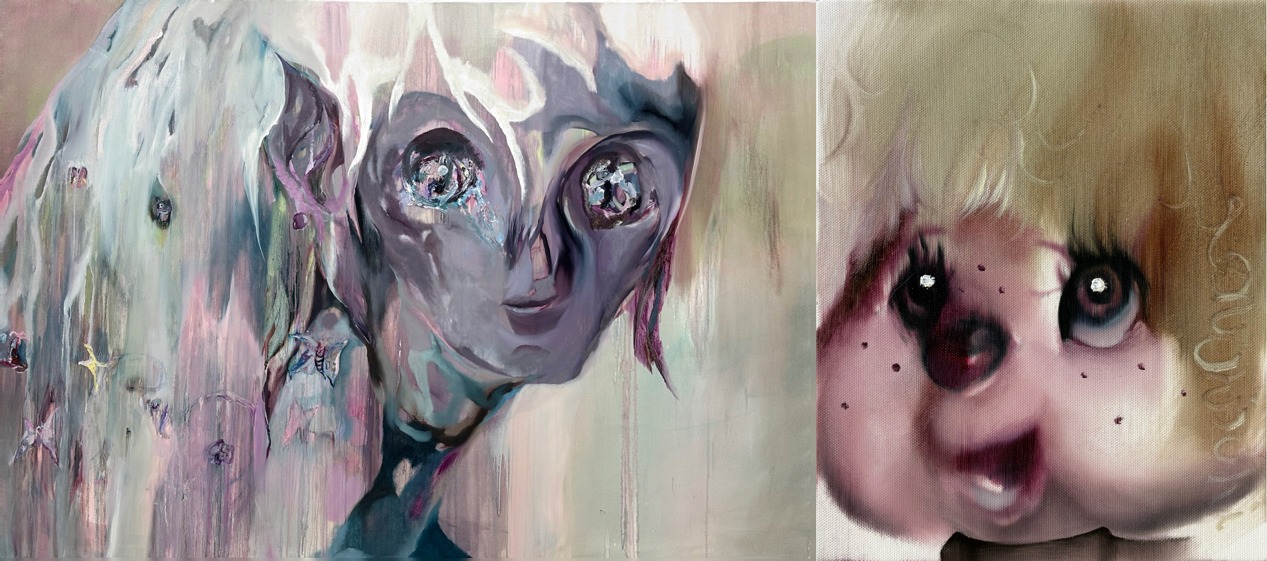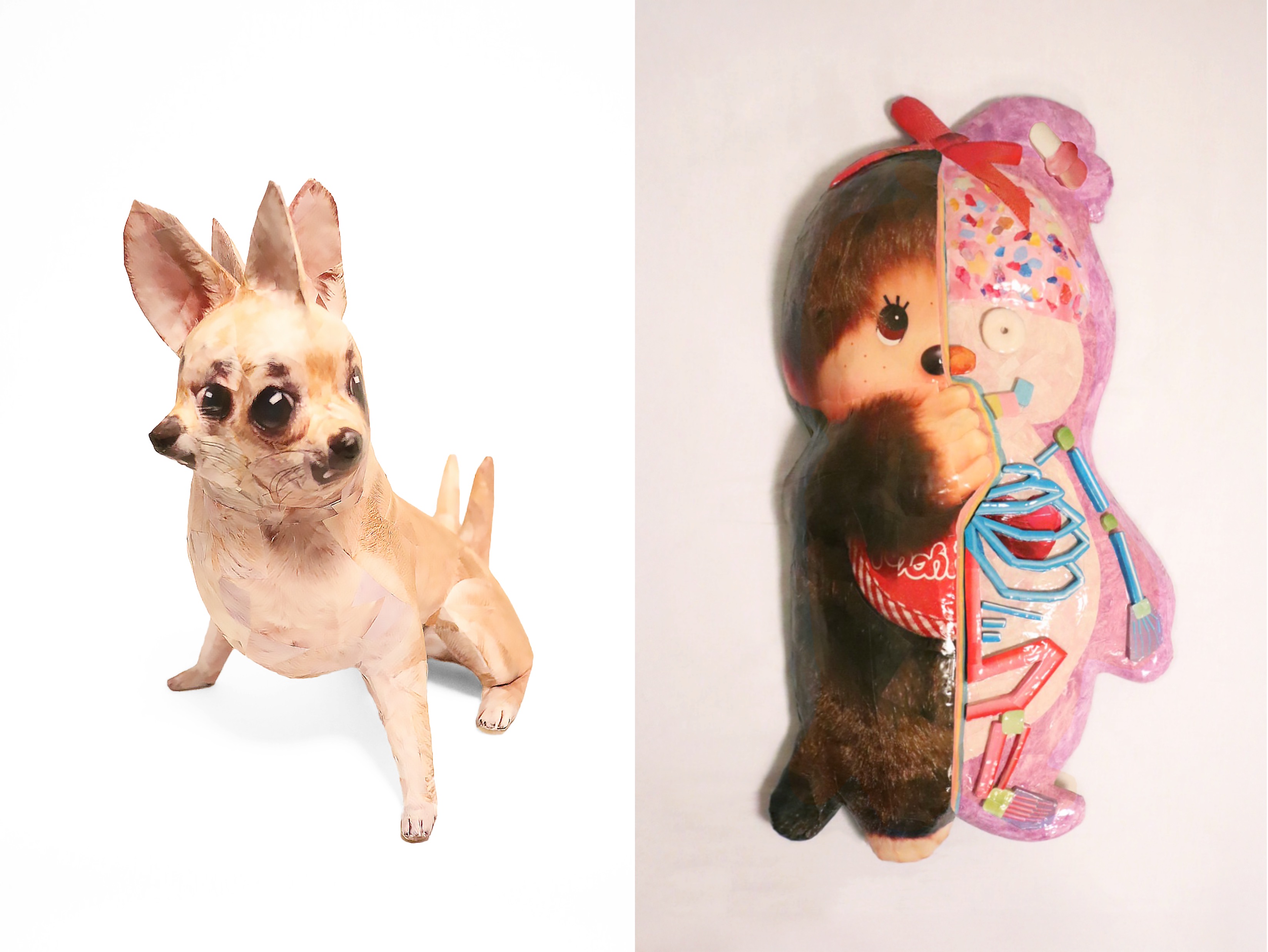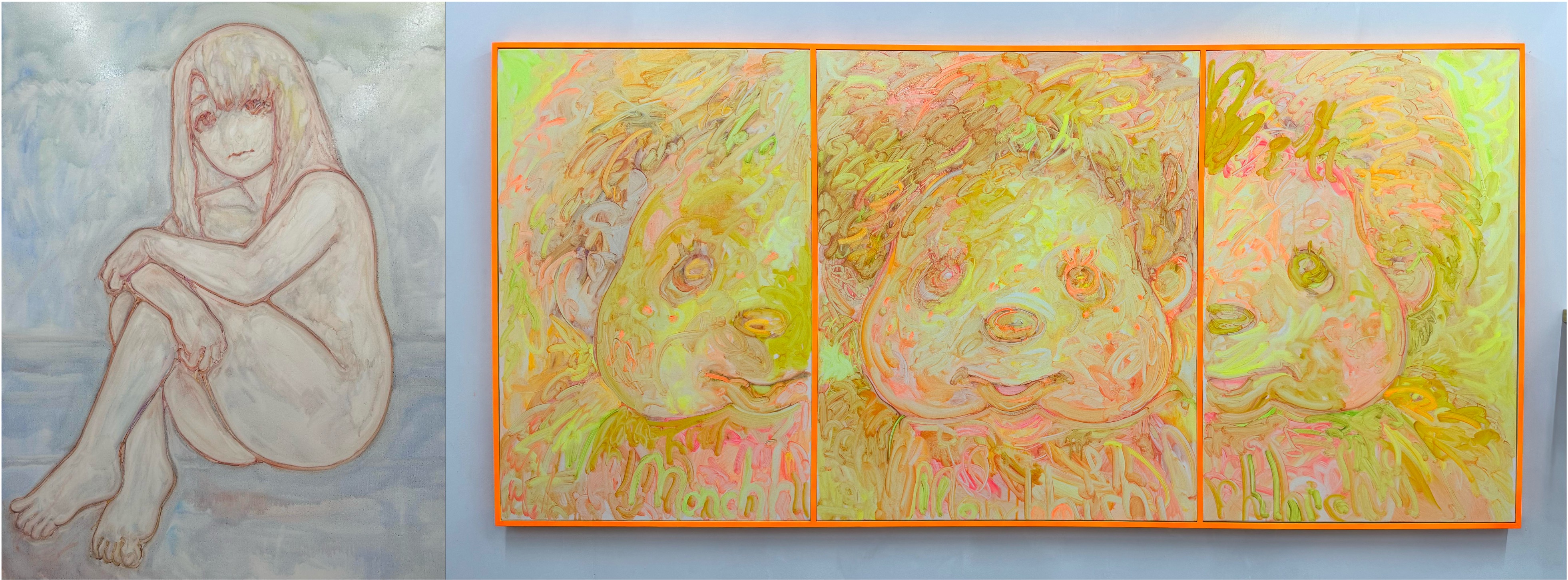 今回ご一緒している、画家の多田恋一朗さんのおかげでモンチッチとのコラボ展に参加することができ、本当に嬉しく思います。制作の一部にはドールが登場することも多く、今回の展覧会にむけてモンチッチというドールと自分の絵がどんな形になるのか自分自身とても楽しみでした。初めてお迎えしたモンチッチは高校生の時に買った信州限定のモンチッチで今もなお大切にしています。ソフビの部分で肌、ファーの部分で毛の両方の要素があるというのは当たり前のようでとても斬新なアイデアであり、本当に生きているような感じがしてとても愛らしいです。ソフビ素材の部分の肌のなめらかさ、毛が生えているという部分のギャップを意識しながら絵の中で生きているモンチッチとしての姿を捉えて制作しましたので、ぜひそちらに目を向けて頂ければ幸いです。