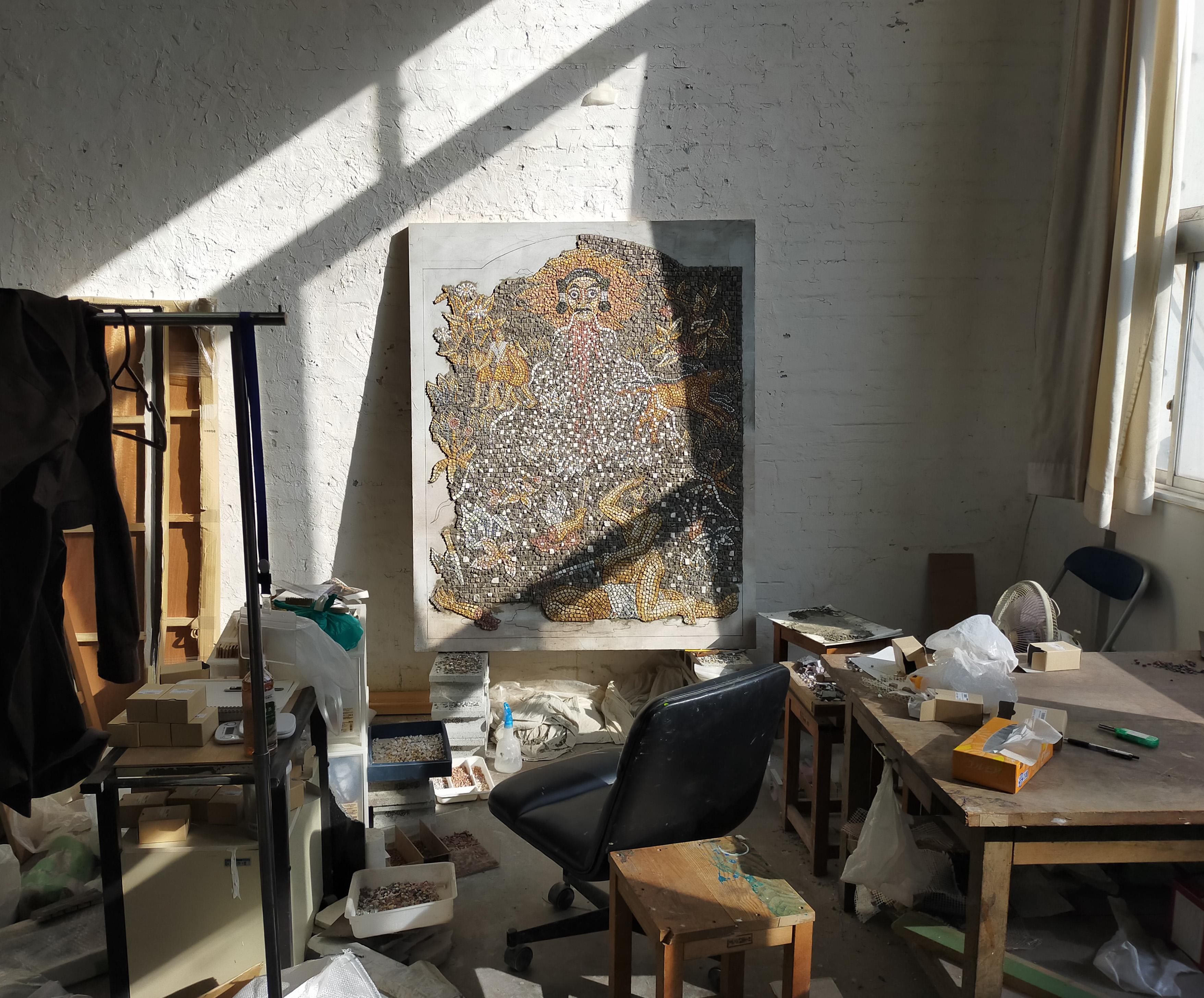 モザイクは油彩画に比べて陰影や細密な描写を持ちません。作家はその「解像度の低さ」に着目し、地域に伝わる民話や神話、伝承の曖昧さや不確かさと重ね合わせながら、作品を制作しています。