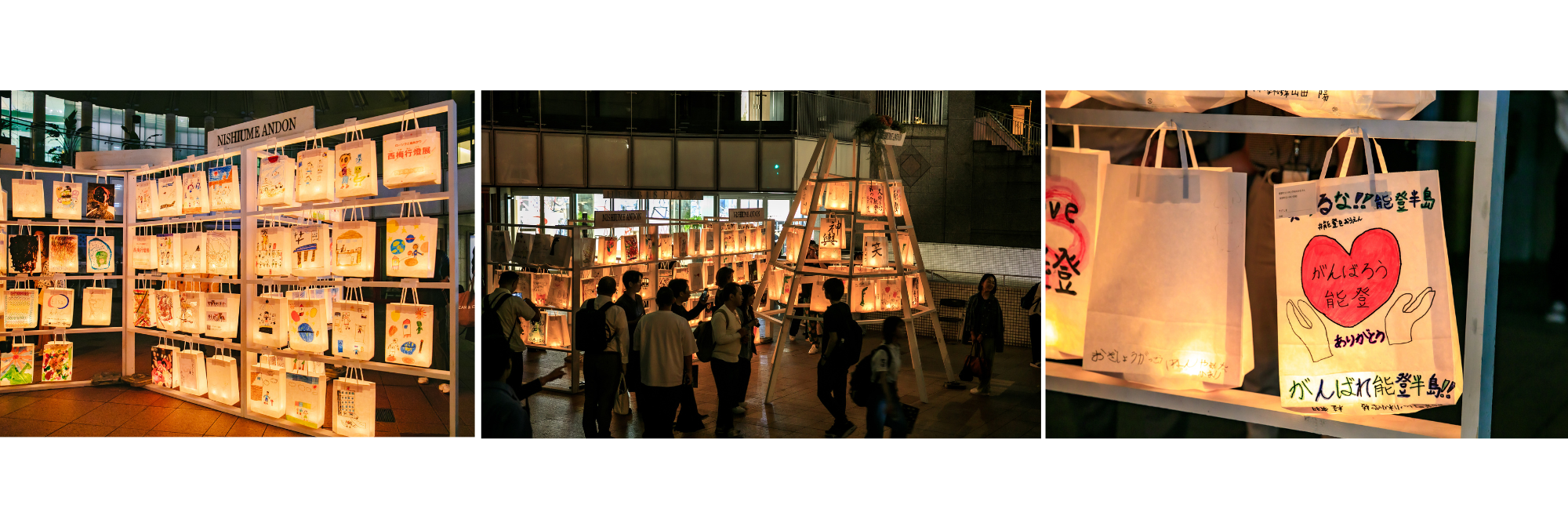 日本古来のあかり「行燈」にヒントを得た、本イベントオリジナルの恒例展示コンテンツ「西梅行燈」。参加者が描いたメッセージや色とりどりのペーパーバッグをキャンドルで照らします。地域の皆さんや子どもたちの描く夢や願い・家族の想い・未来へのメッセージは、優しいキャンドル灯りに浮かび上がって見る者の胸を打ちます。さらに今回も「灯すことそのものが支援になる」取り組みとして、石川・能登半島の方々が描いた復興への祈りの行燈も並びます。ひとつひとつの行燈に込められた想いと個性豊かな表現の数々をご覧ください。