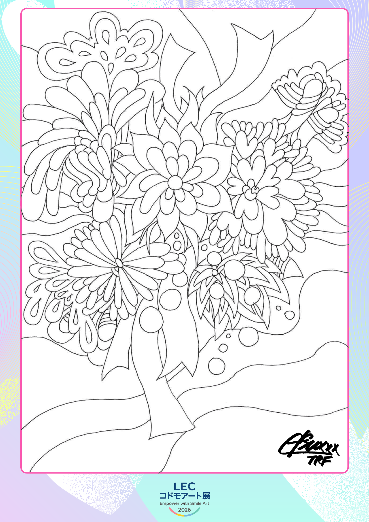 TRFのメンバーとして多くの人に笑顔と希望を届けてきた ETSU さんが、 本プロジェクトのために特別な線画アートを描き下ろしました。線画は、全国の子どもたちがその線画に“未来の色”を自由に重ね、 一枚のぬり絵を通して“希望のパレット”を完成させる、参加型のアート体験です。