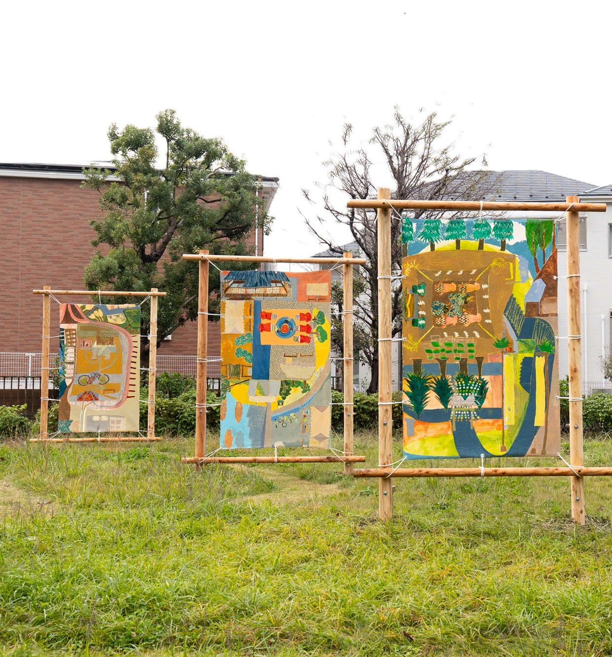 八王子市石川町は約450年続く石川御嶽神社の「竜頭の舞」などが有名で、石川村を発端とした歴史ある町だ。この石川町には「七名字・七氏子」と呼ばれるいまだ謎の多い伝承が残っている。中世後期に石川村の原型を作り上げた七つの名字をもつ系譜の家々がそれぞれ七つの氏神を祀ったとされ、力を合わせて村おこしに励んだそう。作家はこの言い伝えを手がかりに、名前や場所を変えながら今なお現存し人々が守り続けている社を巡り歩き、その姿を石川の風景の一部として眺めた。本作品では作者が石川町を歩き、見て、聞いた現在と過去の景色を巨大なキャンバスへと描いていく。