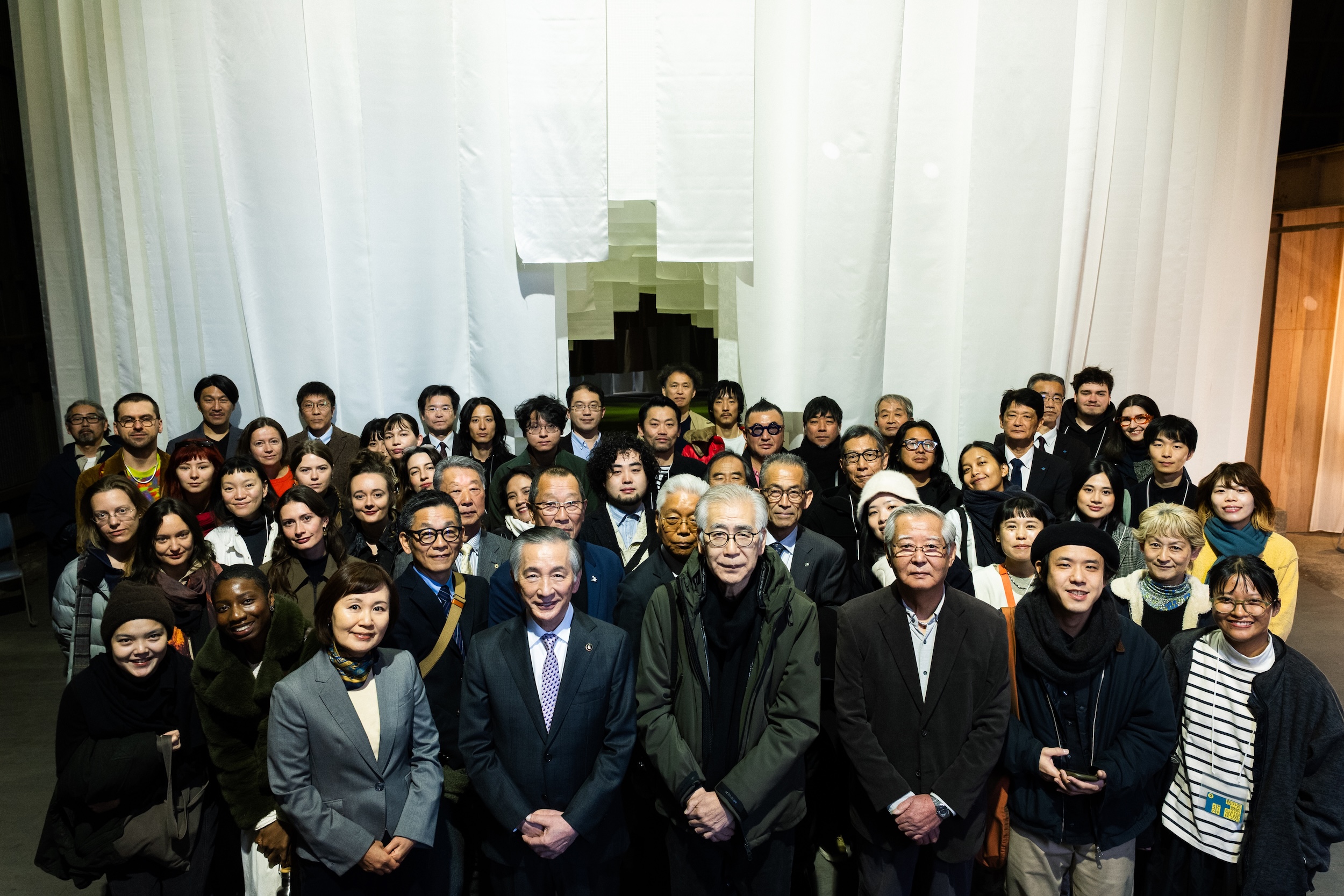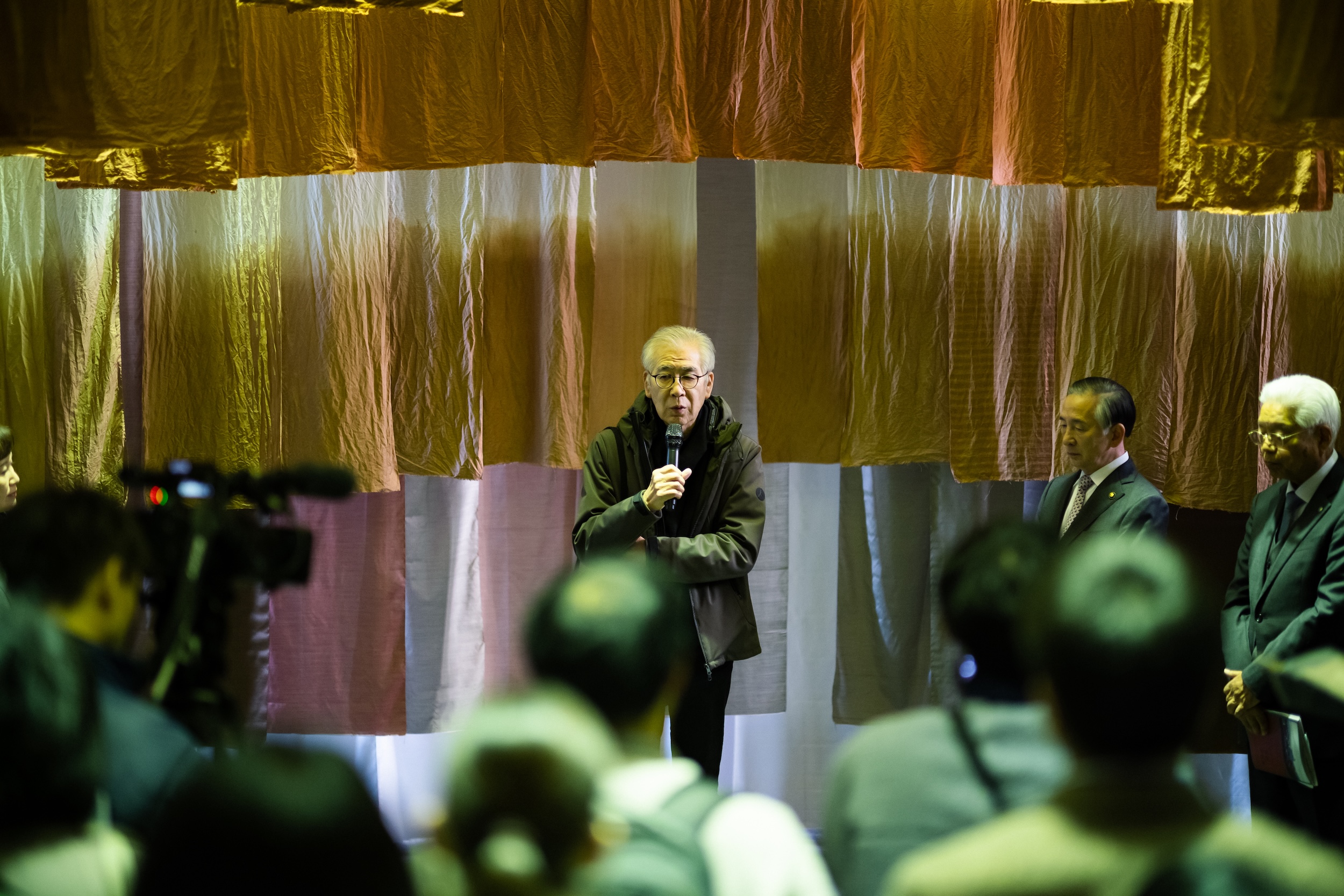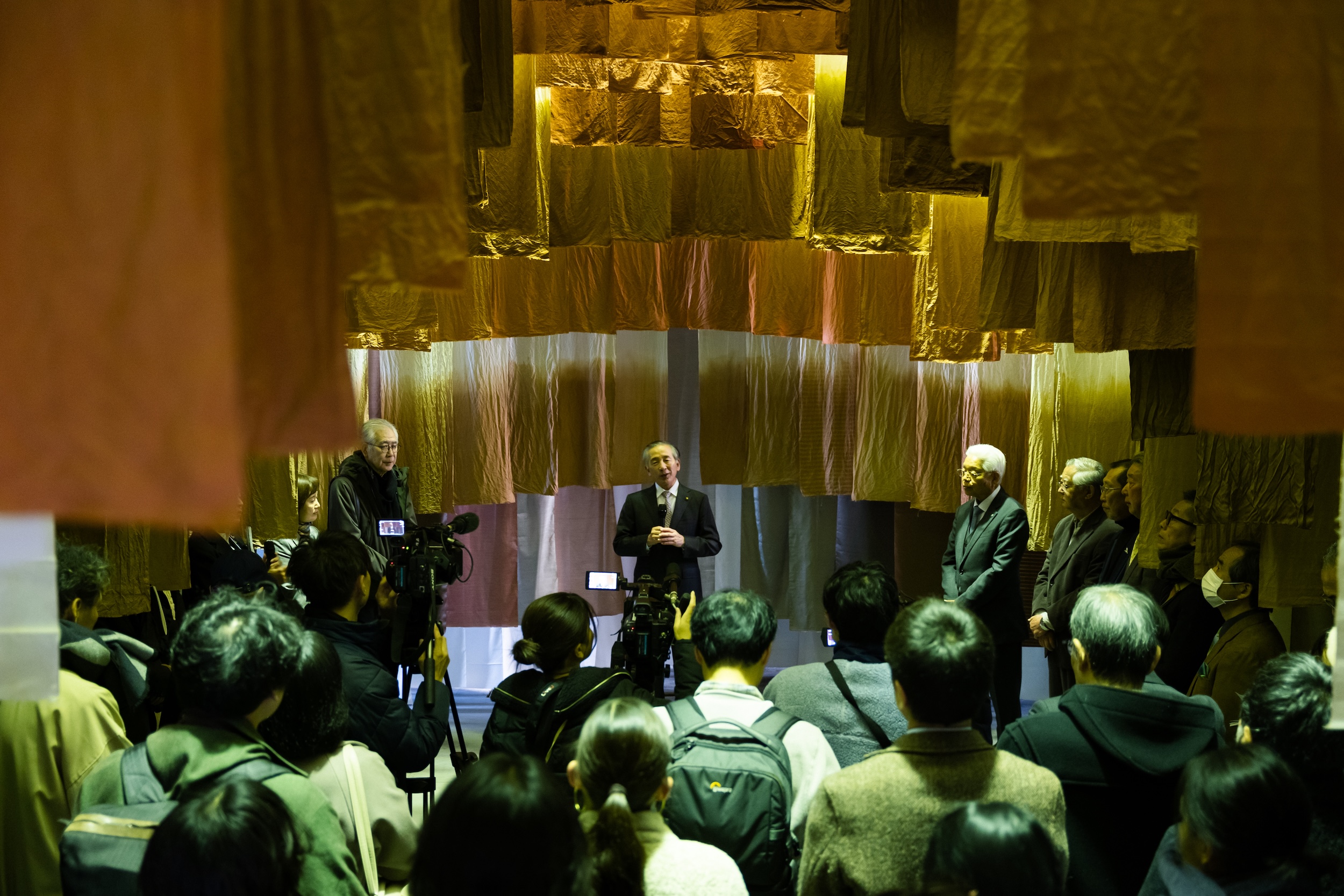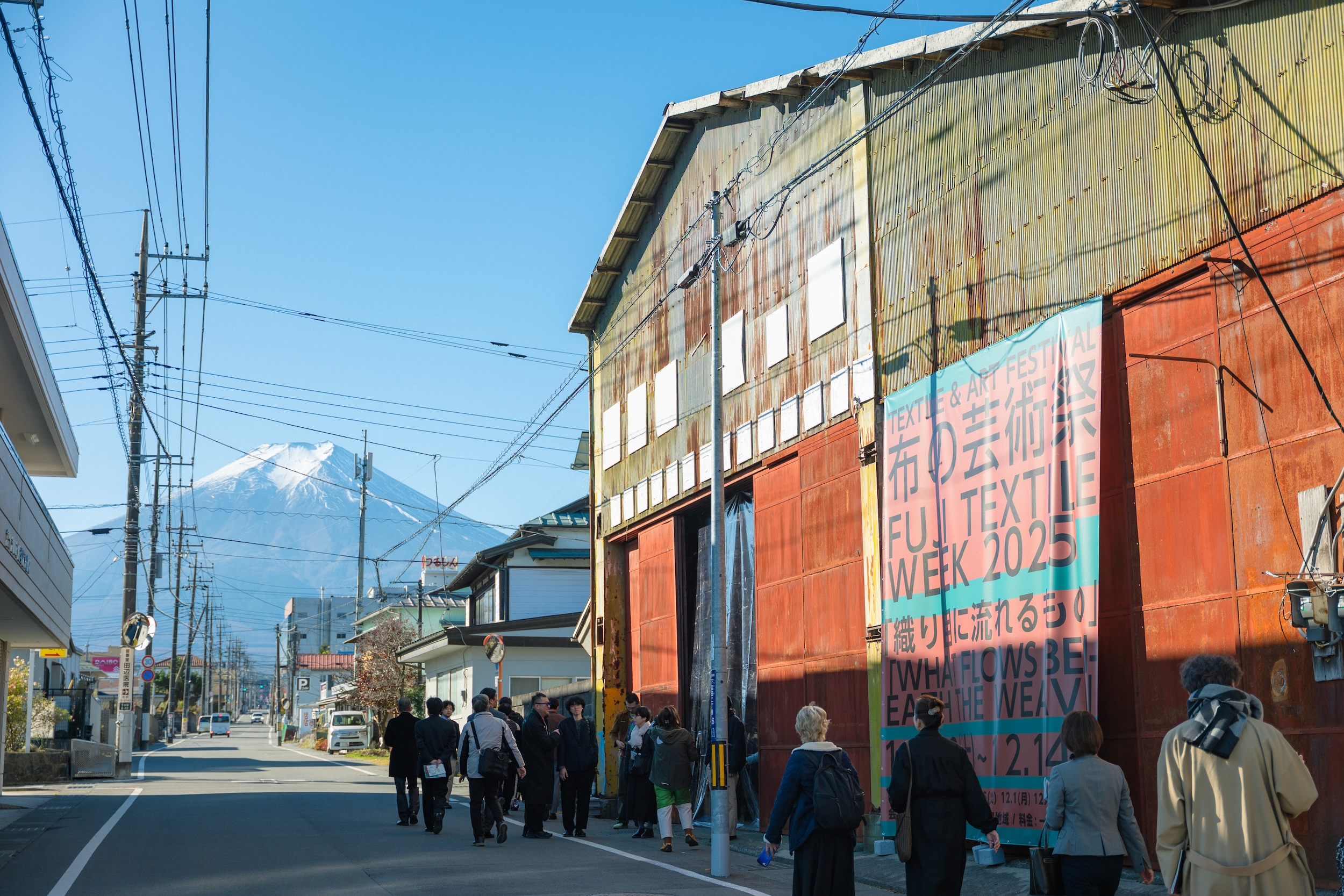 今年で4回目を迎える、山梨県富士吉田市を舞台に織物産業と現代アートが融合した国内唯一の布の芸術祭『FUJI TEXTILE WEEK 2025(フジテキスタイルウィーク)』が、11月22日(土)開幕しました。開幕初日は、かつて織機を取り扱う商社であった旧山叶産業の工場スペースでセレモニーを行い、地元の機屋から譲り受けた布を使った相澤 安嗣志の大規模な作品を前に、富士吉田市長の堀内茂、FUJI TEXTILE WEEK実行委員長(兼アート展ディレクター)南條史生、キュレーターやアーティスト、織物事業者が参加しました。