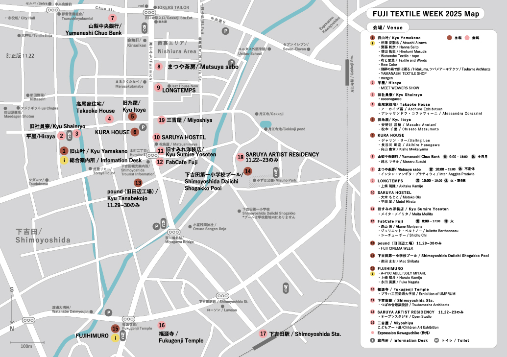 UJI TEXTILE WEEK 2025は徒歩でもまわれるコンパクトな芸術祭。富士吉田市は都内から2時間でアクセスできるので、手軽におでかけいただけます。展示以外にも山梨のテキスタイルグッズを購入できるセレクトショップ、地元のお店によるオリジナルメニュー、織物事業者とのビジネスマッチング展示会など、アート以外の楽しみ方も多数実施されます。