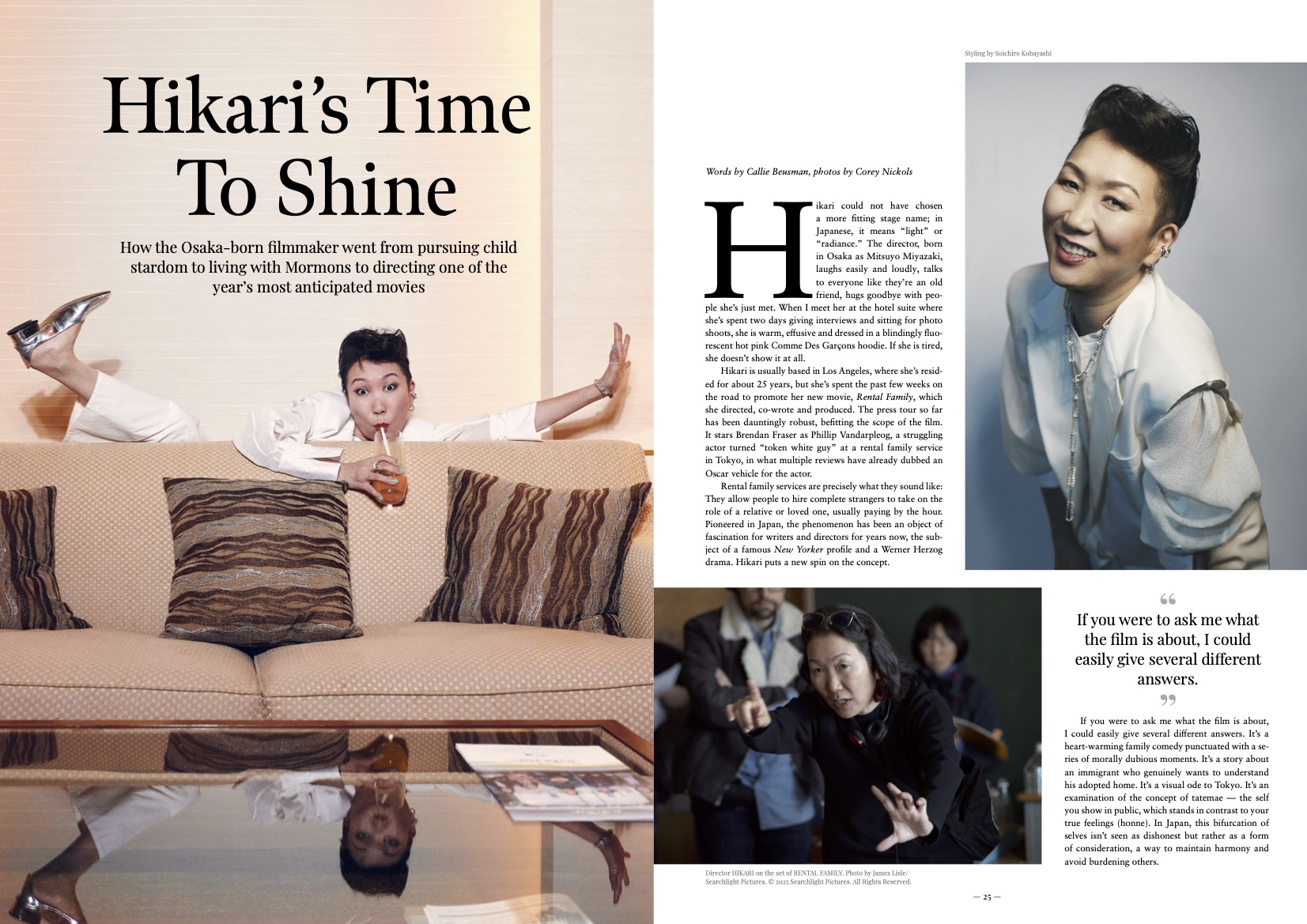今号のカバーには、長編映画『Rental Family』で世界的な注目を集める映画監督・HIKARIが登場。大阪で生まれ、ロサンゼルスへ渡った彼女は、子役時代や多文化背景を持つ経験を経て、独自の視点で作品を生み出しています。