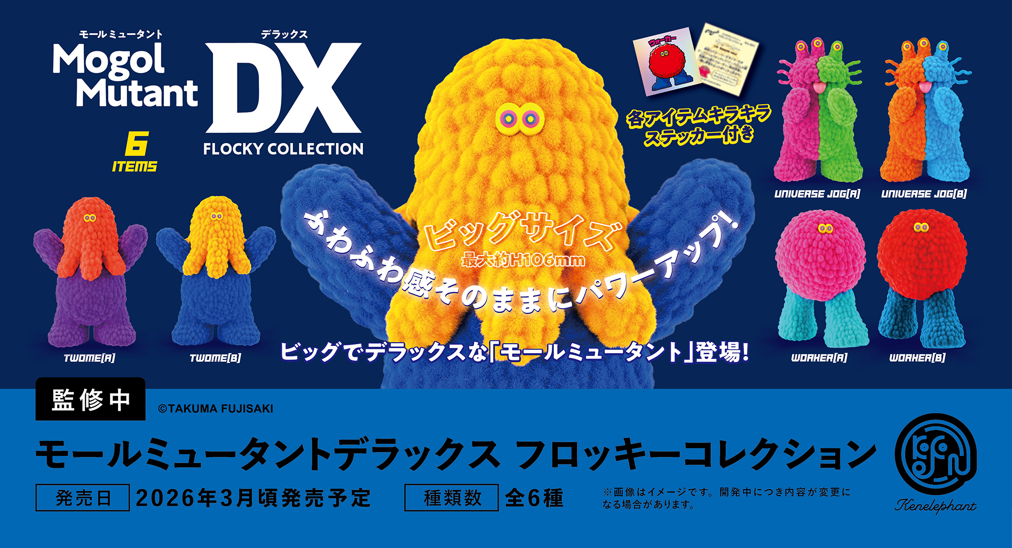 アート雑貨メーカーの株式会社ケンエレファント(本社:東京都千代田区、代表取締役社長:石山健三)は、アートディレクター・フジサキタクマ氏の『モームミュータント』シリーズ最新作となるビッグサイズのフロッキーフィギュア「モールミュータントデラックス フロッキーコレクション」を、2026年3月に発売いたします。それに先駆け、予約を開始いたしました。