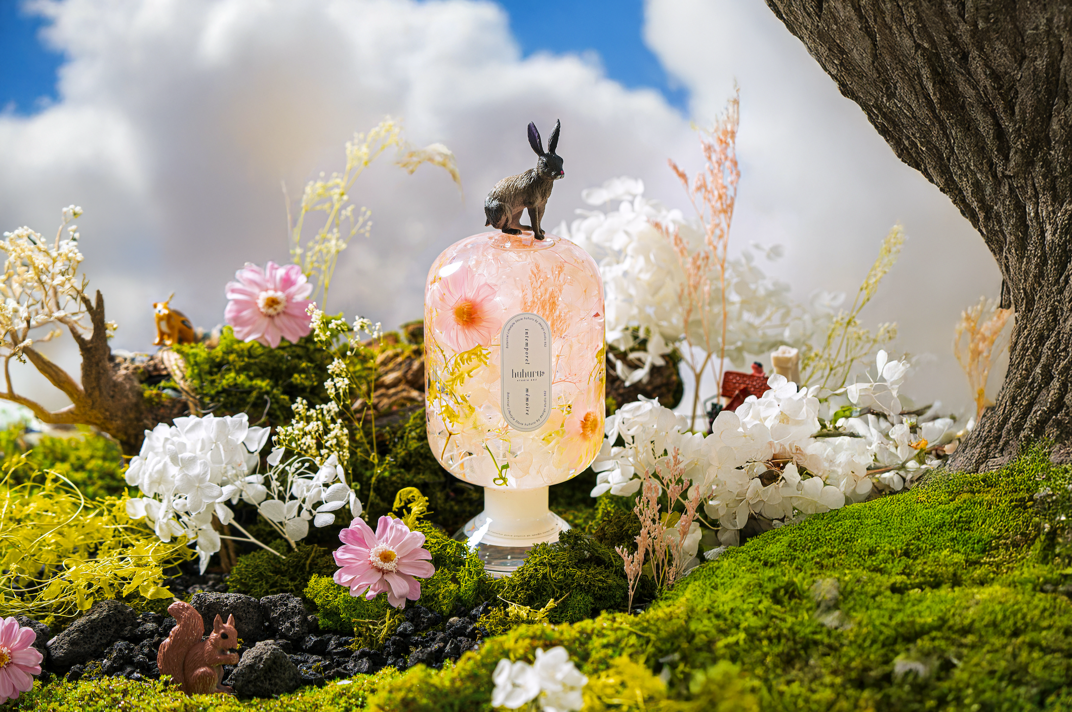 自然の造形を生かした透明感のある作品は、 朝や昼はそのまま置くだけで空間に穏やかな自然の気配をもたらし、夜は底部にLEDライトをセットして灯すと、やわらかな光で植物を包み込み、
