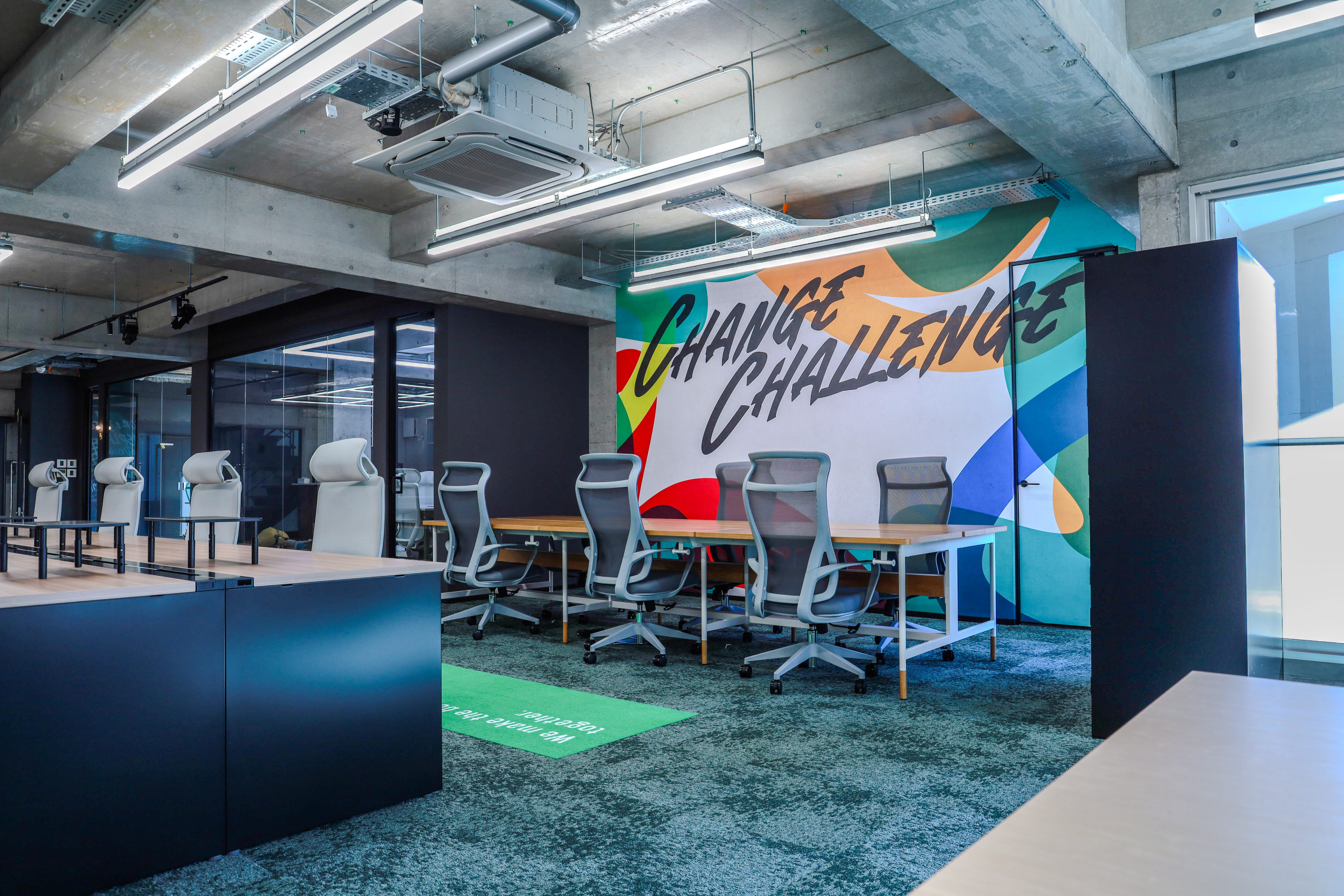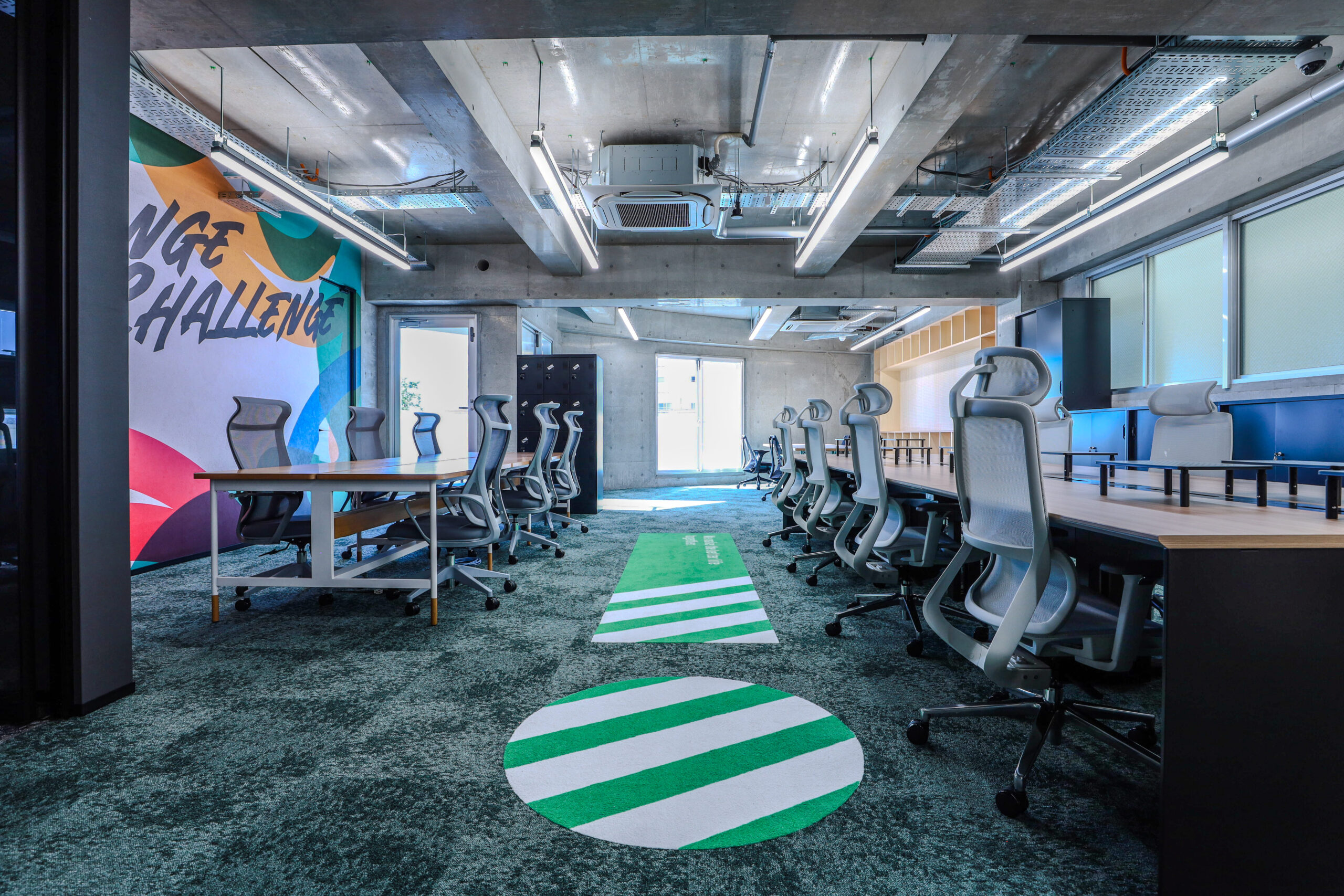 さらに、壁画アーティストチーム『OVER ALLs』にアート制作を手がけていただきました。理念を深掘りしたポップで力強いアートを取り入れ、社内外にインパクトを与えます。社員にとっても来訪者にとってもポジティブに、カルチャーを直感的に伝える場を目指します。
