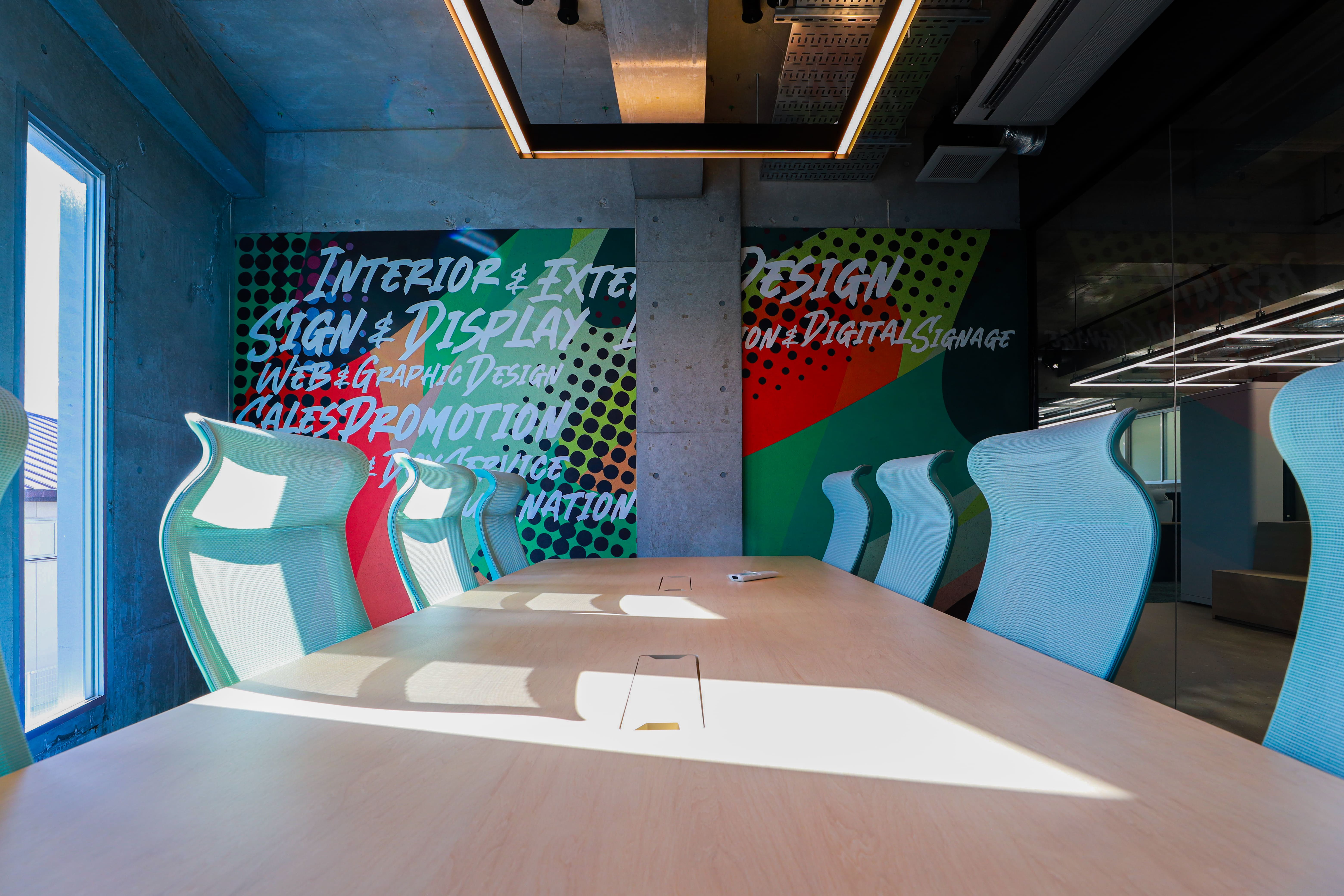 『原点回帰』を象徴する3Fには、経営判断や重要会議、社員との面談などを行うためのfun!ction roomを設置しています。ここには、壁画アーティストチーム『OVER ALLs』による幅7mの迫力ある壁画を配置。ハイテクノの想いや情熱を存分に反映していただき、パッションを表現したアート作品となりました。社員にとっては理念を身近に感じられ、来訪者には企業のカルチャーを直感的に伝える存在です。