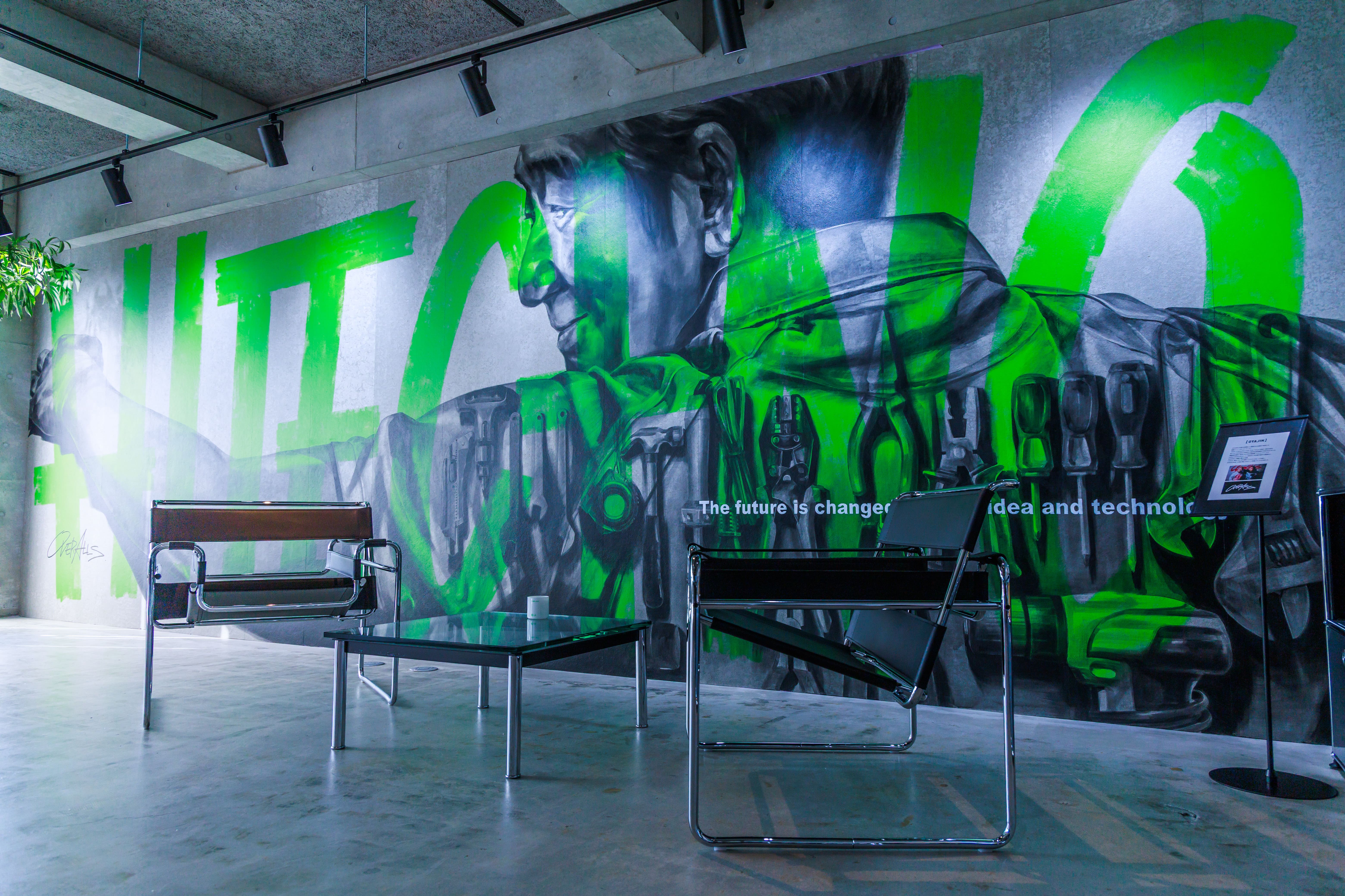 企業理念や人の想いを深掘りし、ストーリー性のあるアートを生み出すOVER ALLsの作品に強く惹かれたことがキッカケとなり、新本社の壁画制作を依頼。実際にOVER ALLsのオフィスを訪問するなど、積極的にアプローチを重ねて、アート制作が実現しました。今回の壁画制作は、ハイテクノの想いを反映し、社員が自社の理念を体感できる象徴的な存在に。来訪者にもハイテクノらしさやカルチャーが直感的に伝わる場所になると考えています。