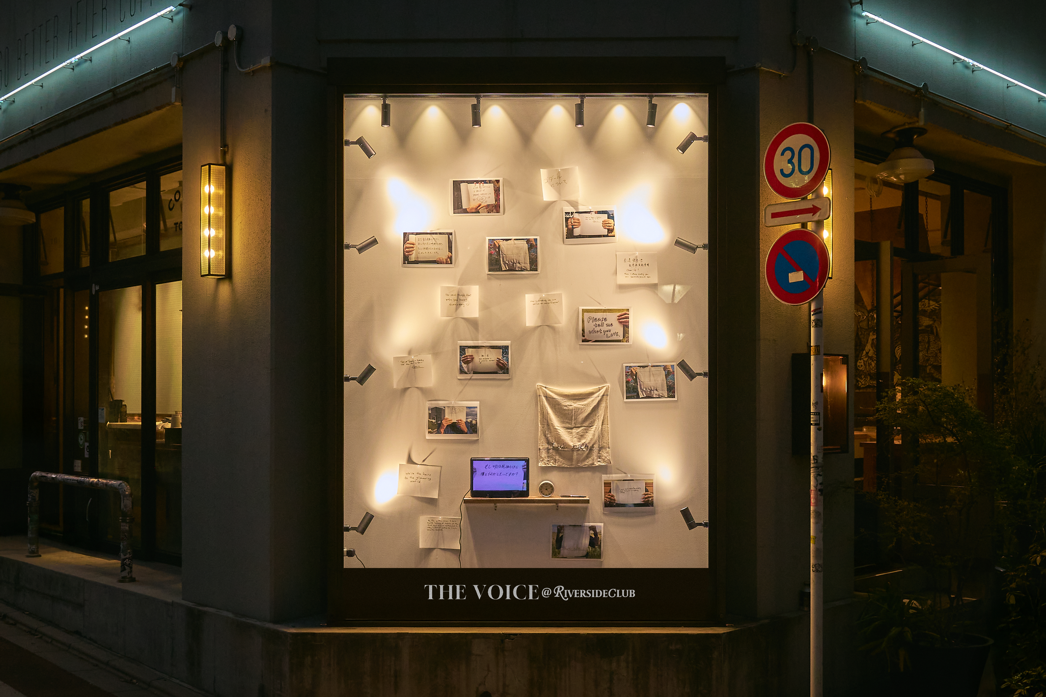 カルチャー・ハブとしての役割を強めるため、RIVERSIDE CLUBではアートに関わる取り組みも本格的に拡張しました。店外の壁面ウインドウでは、アーティスト・稲垣直子によるアートプロジェクト「THE VOICE」を始動。3ヶ月ごとに更新されるこの展示は、街ゆく人々に社会的メッセージを投げかける“公共のキャンバス”として機能します。