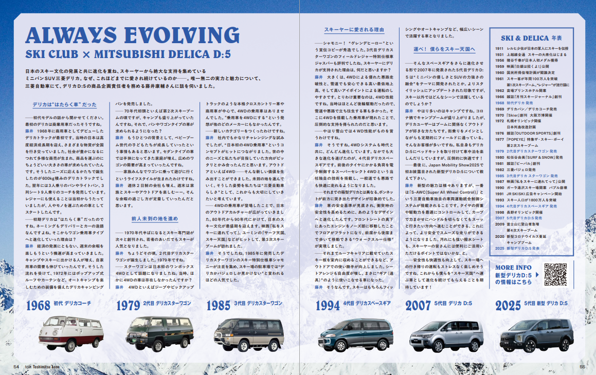 日本のスキー文化の発展と共に進化を重ね、スキーヤーから絶大な支持を集めている ミニバン SUV 三菱デリカ。なぜ、これほどまでに愛され続けているのか─。唯一無二の実力と魅力について、 三菱自動車にて、デリカ D:5 の商品企画責任者を務める藤井康輔さんに話を伺いました。