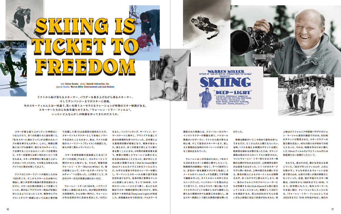 リフトから転げ落ちるスキーヤー、パウダーを巻き上げながら滑るスキーヤー、 そしてチンパンジーまでがスキーに挑戦。 今のスキーフィルムとは一味違う、笑いを誘うユーモラスなナレーションが特徴のスキー映画がある。 スキーヤーたちの心を長年躍らせてきた、” ウォーレン・ミラー・フィルム “。 いったいどんな人がこの映画を作ってきたのだろうか。