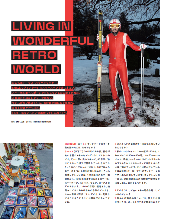 彼の名はトーマス・バッハネッツァー。 SNS 上でヴィンテージのスキースーツを身にまとい、 スキー板を並べてポージングをしている彼に魅了された。 これはただのコレクターではない。 センスが飛び抜けている。彼の世界観に心を奪われ、 質問を投げかけてみた。 「スキー板をいったい何本持っているの?」と。