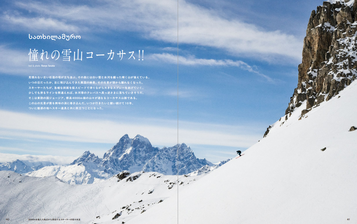 見慣れない古い石造の塔が立ち並ぶ。その奥には白い雪と氷河を纏った輝く山が聳えている。 いつの日だったか、目に飛び込んできた異国の絶景。その光景が頭から離れなくなった。 スキーヤーたちが、急峻な斜面を猛スピードで滑りながら大きなスプレーをあげていく。 少しでも滑るラインを間違えれば、氷河帯のクレバスへ真っ逆さまに落ちていきそうだ。 そこは東欧の国ジョージア、標高4000m級の山々が連なるコーカサス山脈である。 この山の光景が僕を興味の渦に巻き込んだ。いつか行きたいと願い続けて10 年、ついに魅惑の地へスキー道具と共に旅立つことになった。