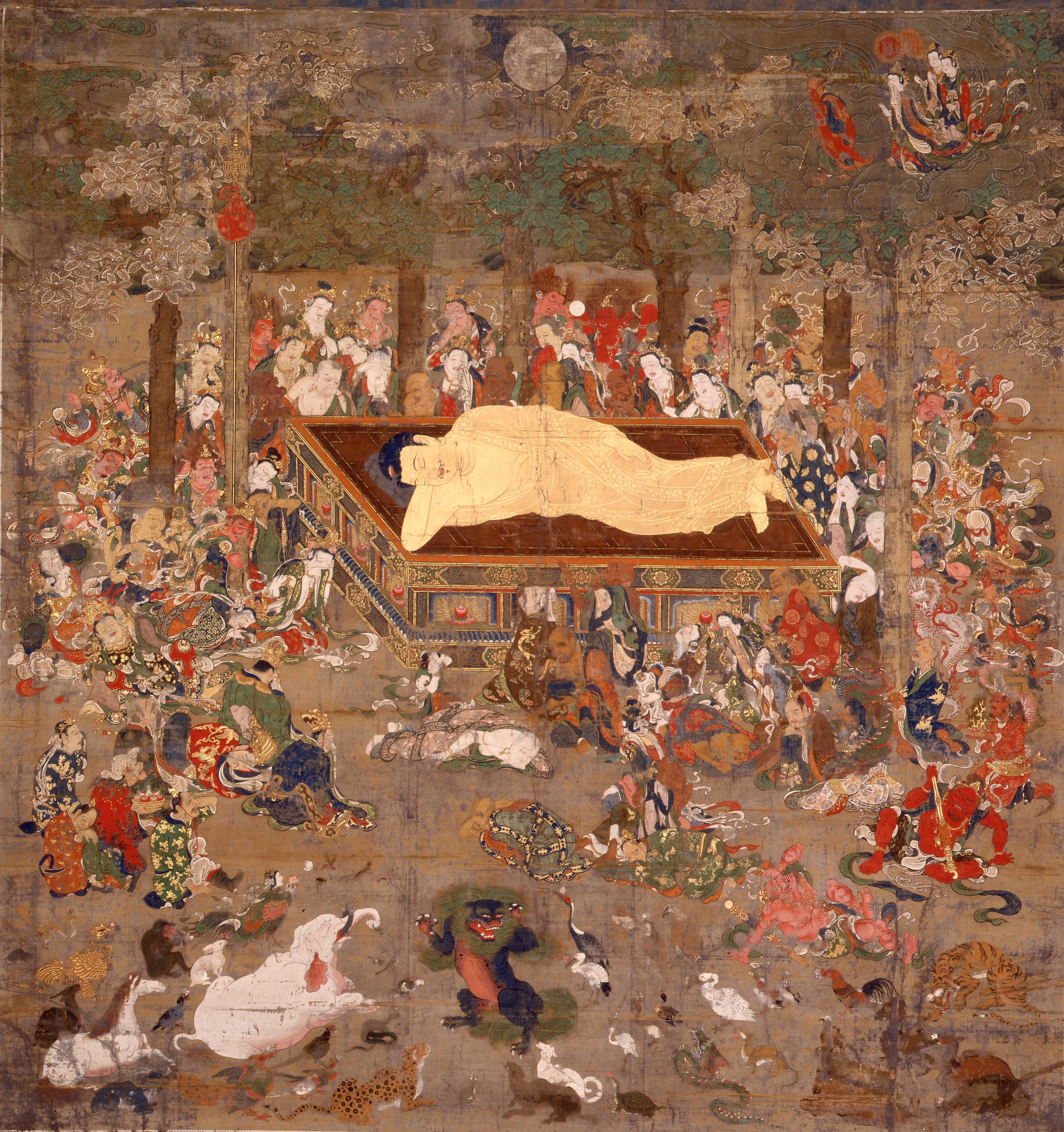 インドのクシナガラにおける釈迦の涅槃の情景を描く。釈迦は沙羅双樹(しゃらそうじゅ)の下で弟子や菩薩、動物等に囲まれ静かに横たわる。上空から雲を走らせ降り来るのは釈迦の母・摩耶(まや)夫人の一行。周囲の人々や動物は全身全霊で悲哀を表している。