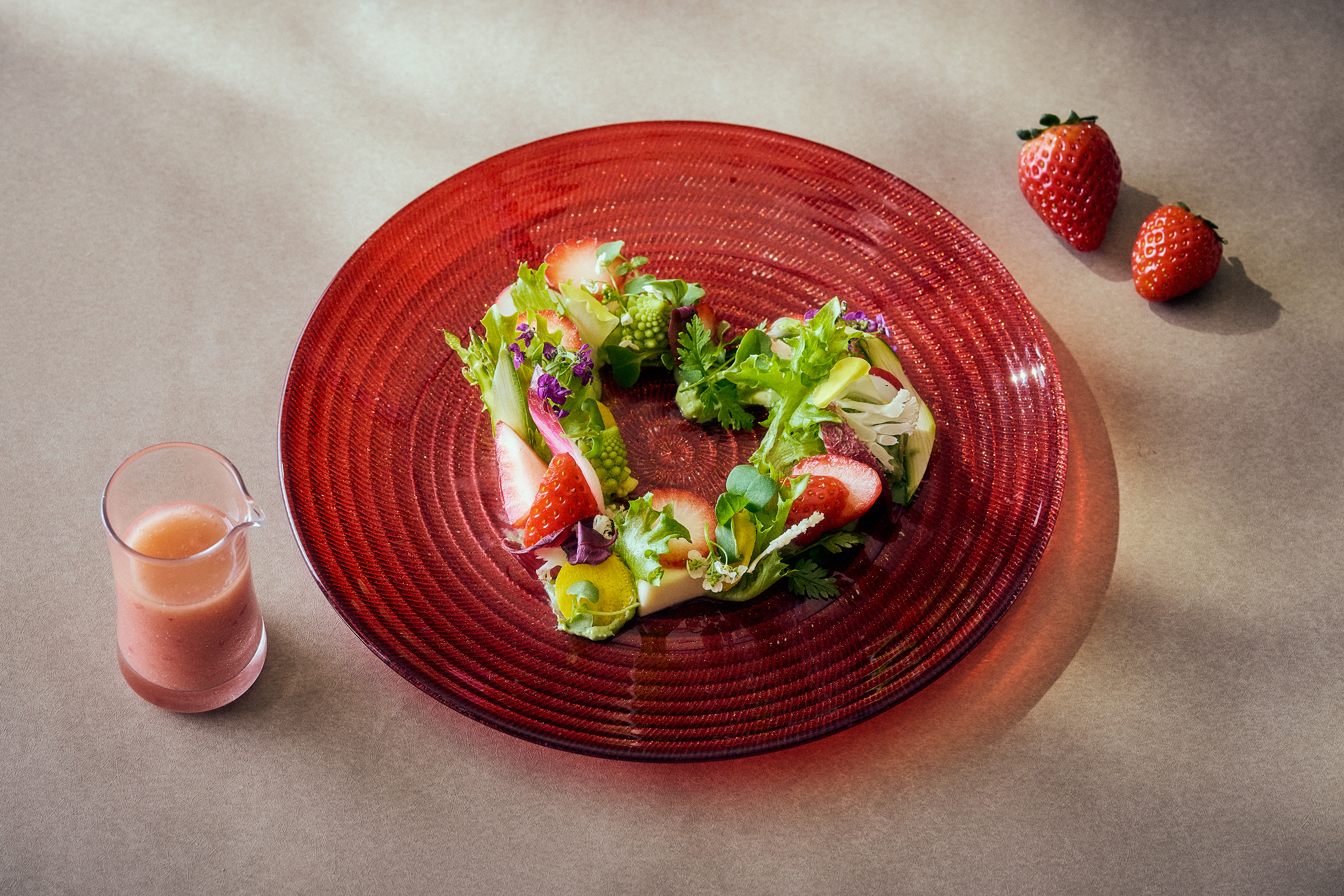 スイーツプレートは、ストロベリーとクレーム・ムースリーヌをピスタチオとアーモンドのスポンジで挟んだケーキを中心に、絵の具を混ぜたようなデザインのストロベリーレアチーズタルトや一晩紅茶に浸したドライフルーツを練りこんだイギリスの郷土菓子バラブリス、ストロベリーを挟んだミニエクレアやストロベリーマカロンを美しく並べ、アートのように描きます。ハーブクリームのサブレやビーツのタルト、パルメザン風味やストロベリー紅茶のスコーンを並べたプレートには、パプリカソースやパンプキンムースでパレットの絵の具を表現。ハートを描いたストロベリーのカプレーゼサラダと共に季節ならではの味わいをお楽しみいただけます。
