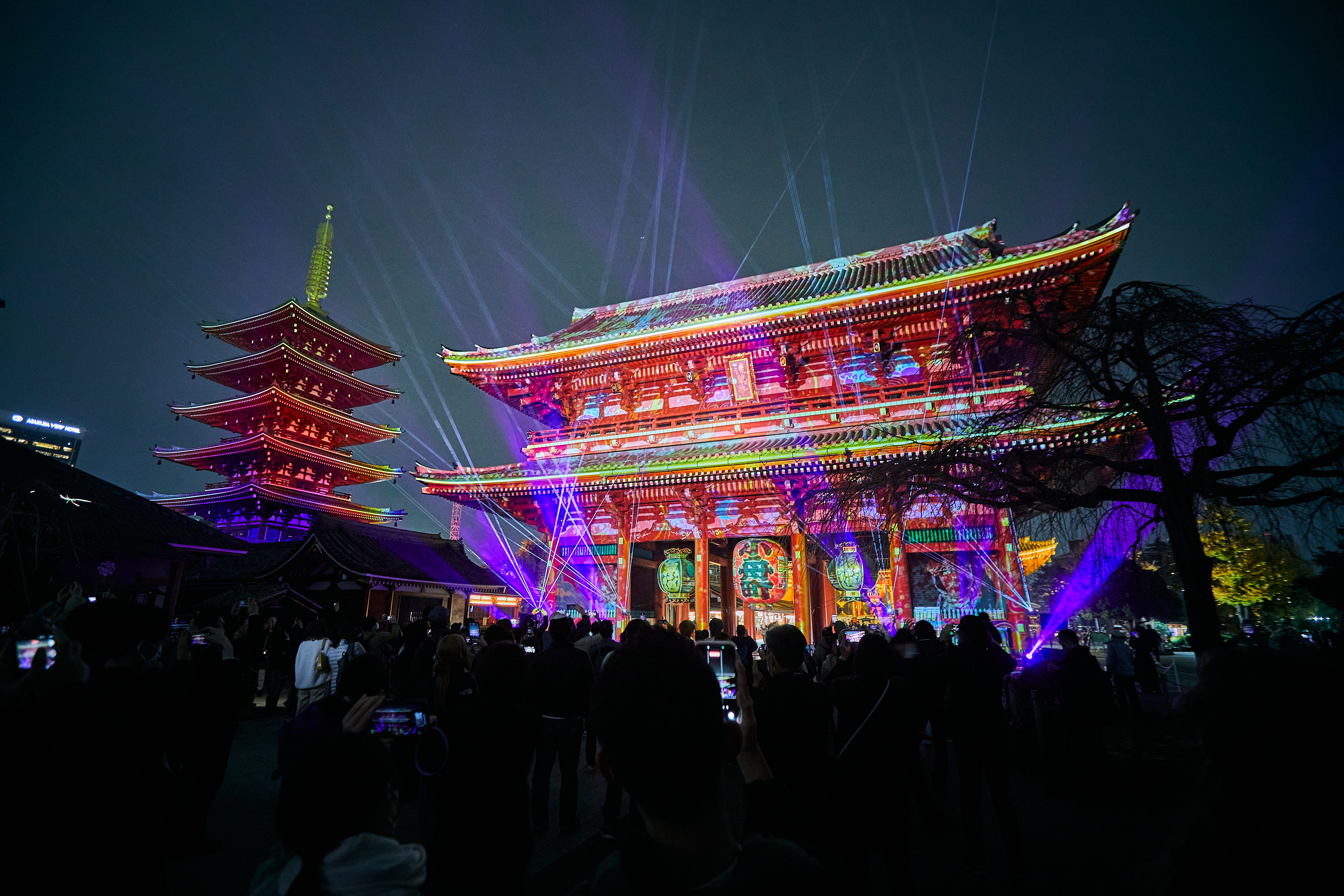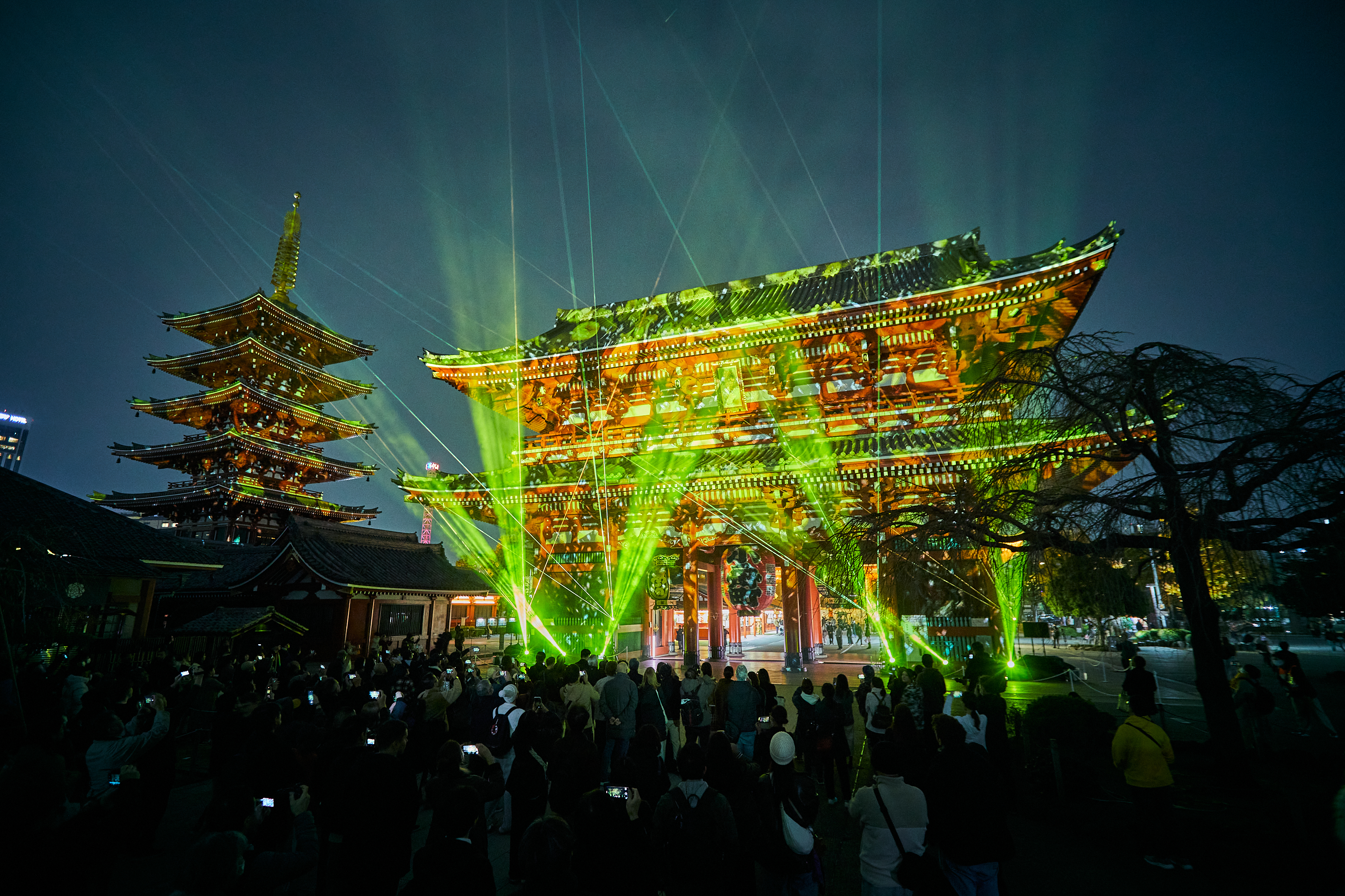 浅草寺の宝蔵門、五重塔、重要文化財 二天門に先端技術を駆使したデジタルアニメーションや浅草寺1,400年の歴史・文化をモチーフにした壮麗なプロジェクションマッピング映像を投影しました。