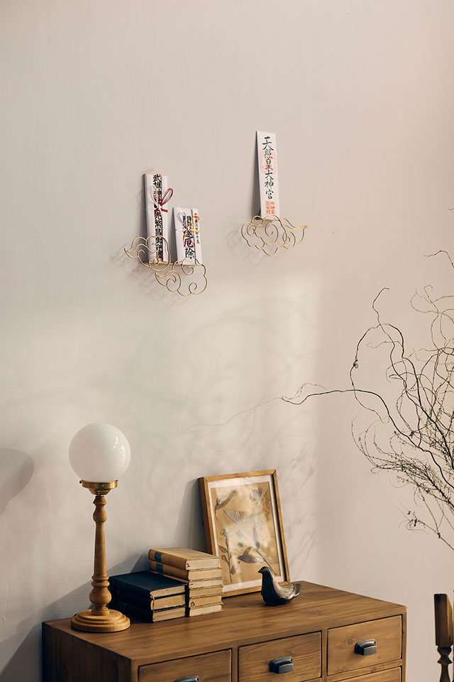 一般的には木製の神棚が広く普及していますが、クラッシュではあえてスチールや真鍮といった素材を採用。洋のテイストを取り入れつつ、そこに雲や日の出といった和のモチーフを使ってデザインすることで、縁起の良さやハレの日、吉祥のイメージも感じられる多様な住空間に調和する神棚に仕上げています。