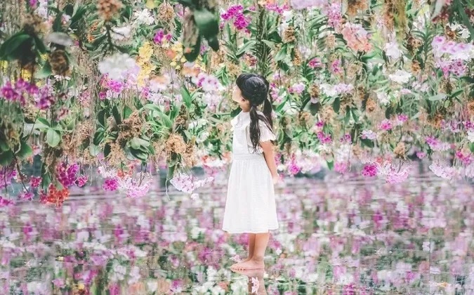 無限に広がる水の空間に足を踏み入れ、泳ぐ鯉にそっと触れると、瞬く間に季節の花へと姿を変える「チームラボプラネッツ」を象徴する人気アート作品です。