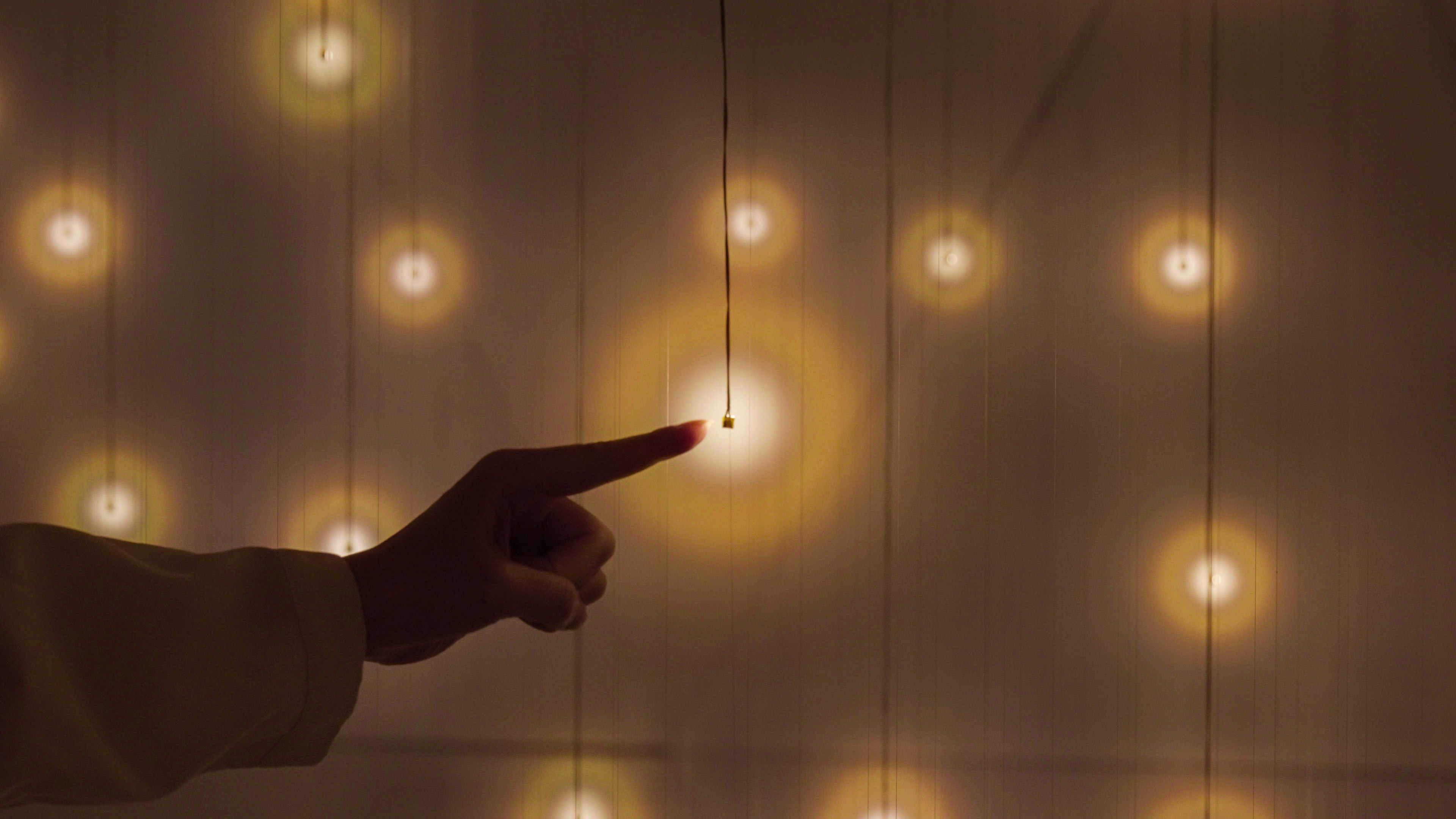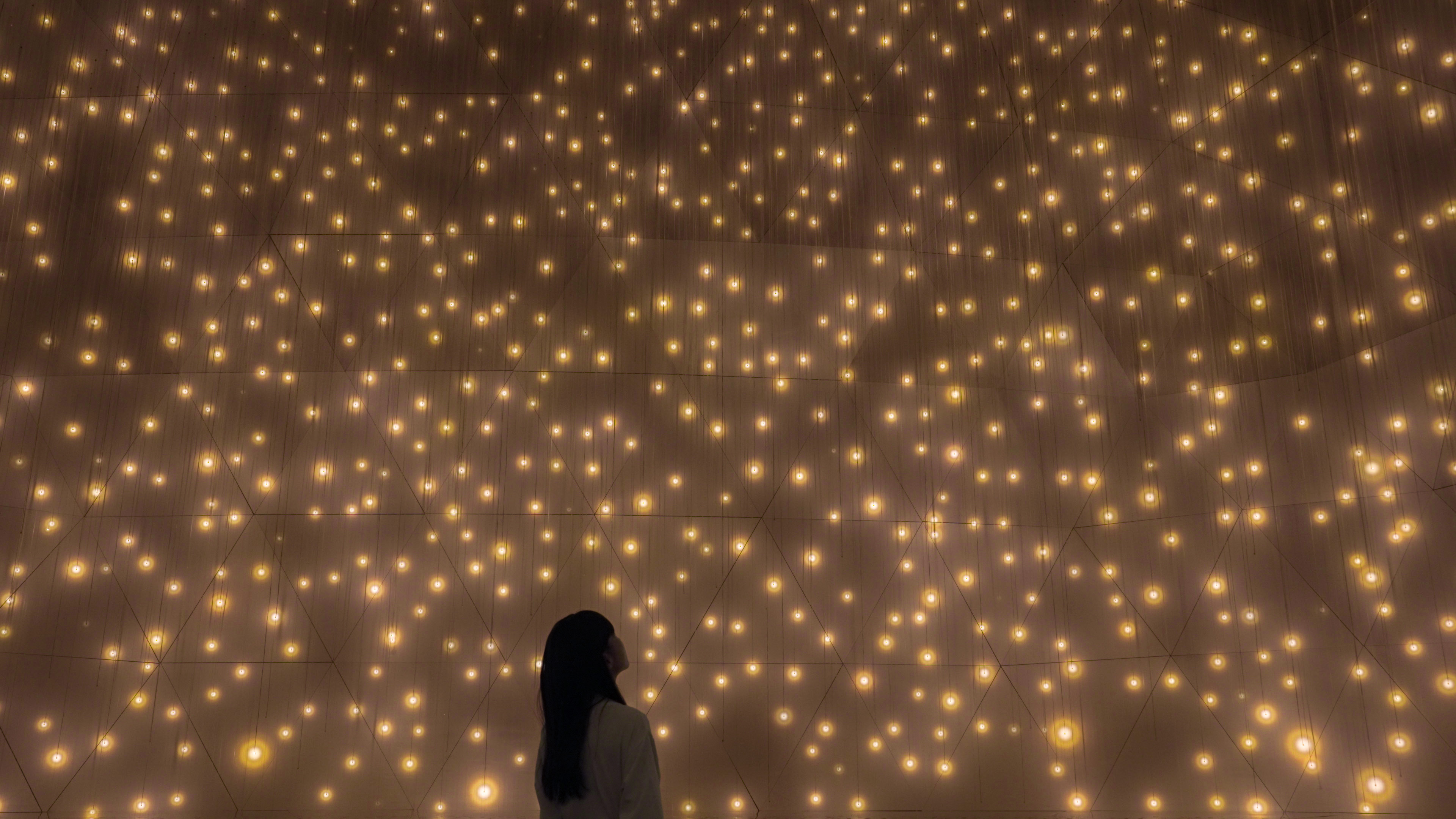 無数の光の球体群が強く輝き、周辺の球体へ呼応し連続していく作品《質量のない太陽と闇の太陽》が新たに公開。
