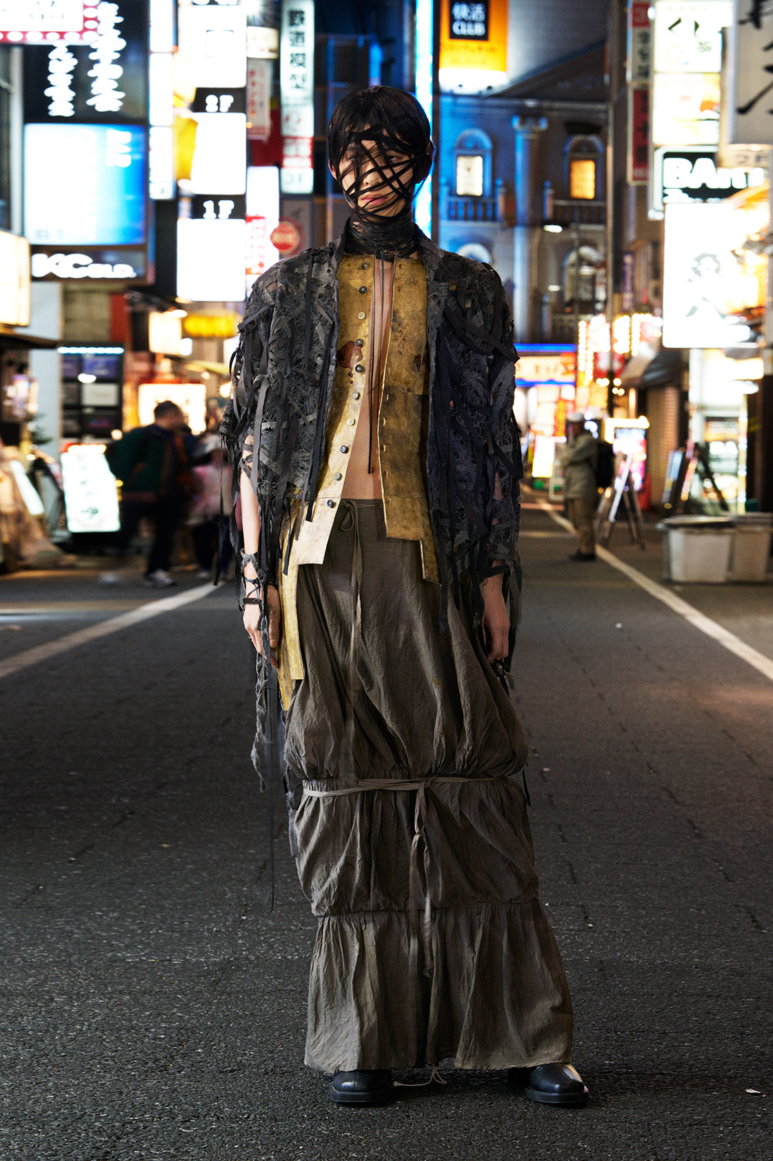 サイズフリーで、巻き付け方・結び方によってシルエットが変化し、スタイリングの主導権は着る人自身に委ねられる。決められた正解がないからこそ、着ることが遊びとなり、身体の多様性が肯定される。下半身にはウエストが約4mまで伸びるニットパンツ、上半身にはパネル状のニット2枚を自由に巻き付ける構成とした。