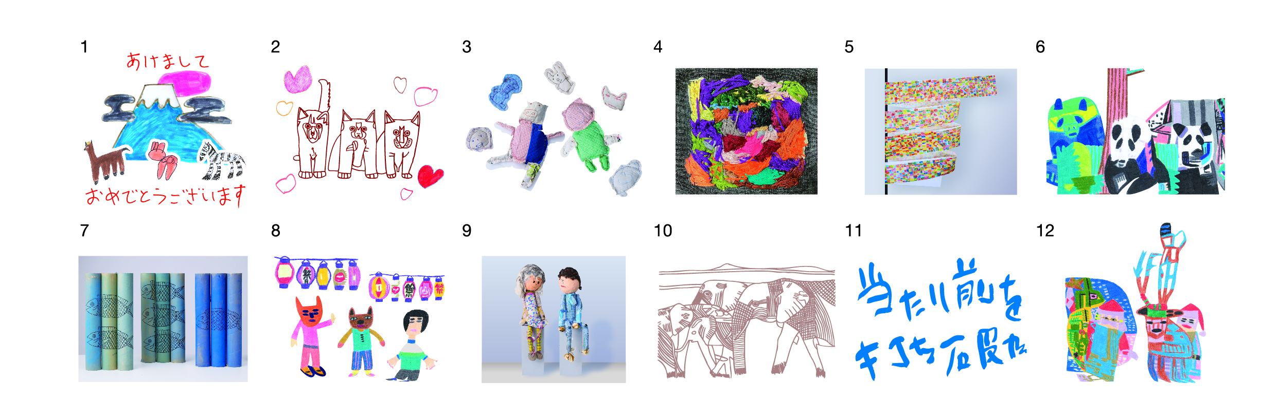 アール・ブリュットのカレンダーの制作は、昨年に引き続き2年目で、今年はSFRNから9名、ヨナワールドから5名、計14名のアーティストに参加していただきました。カレンダーはイラストに加え、布や紙管を使った立体作品も掲載しています。1月の富士山、12月のサンタクロースなど季節感あふれるデザインのほか、カラフルで美しい色合いの立体作品など、アーティストの個性が光るさまざまなアートが楽しめます。