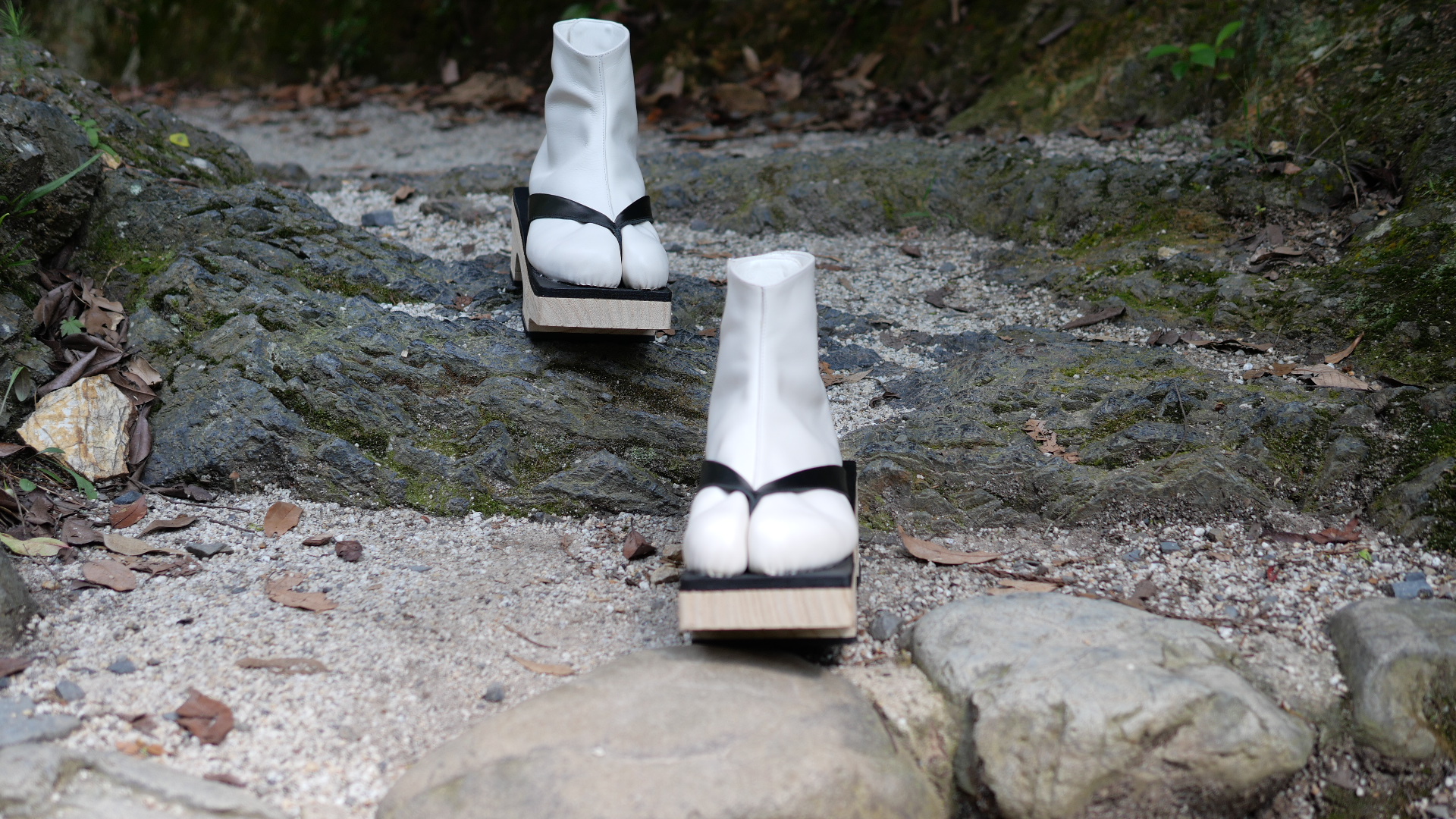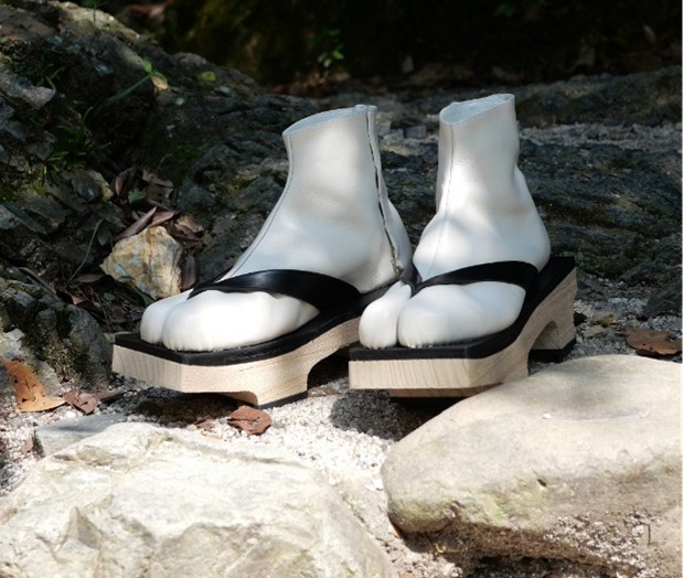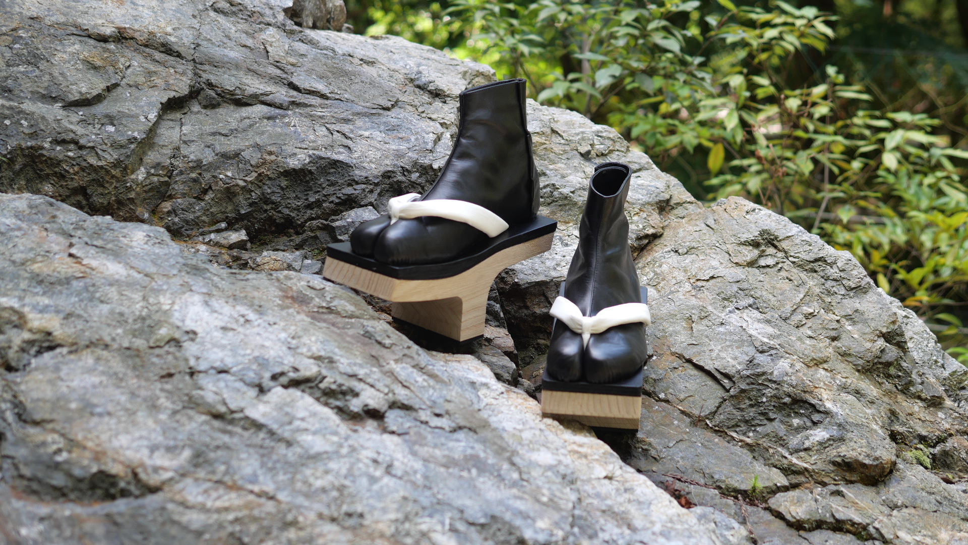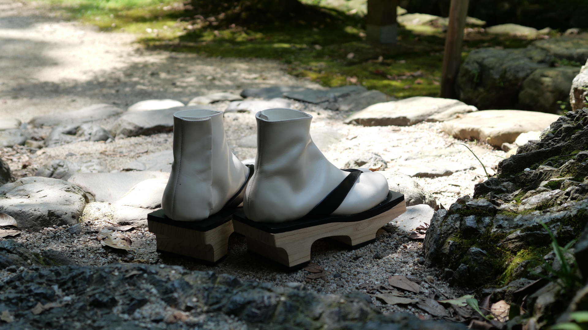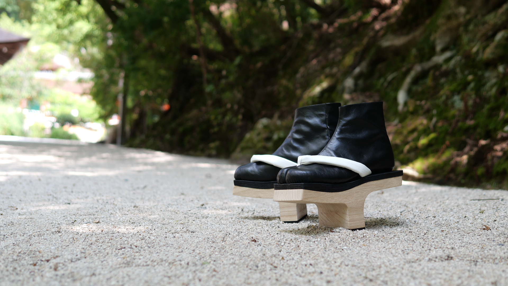 本作は、日本の伝統的な足袋の構造と西洋の革靴文化をもとに設計した底面構造とアッパーを、京都の伝統工芸士の協力のもと製作した桐材による一本歯下駄・二本歯下駄のソールに組み合わせた一足です。