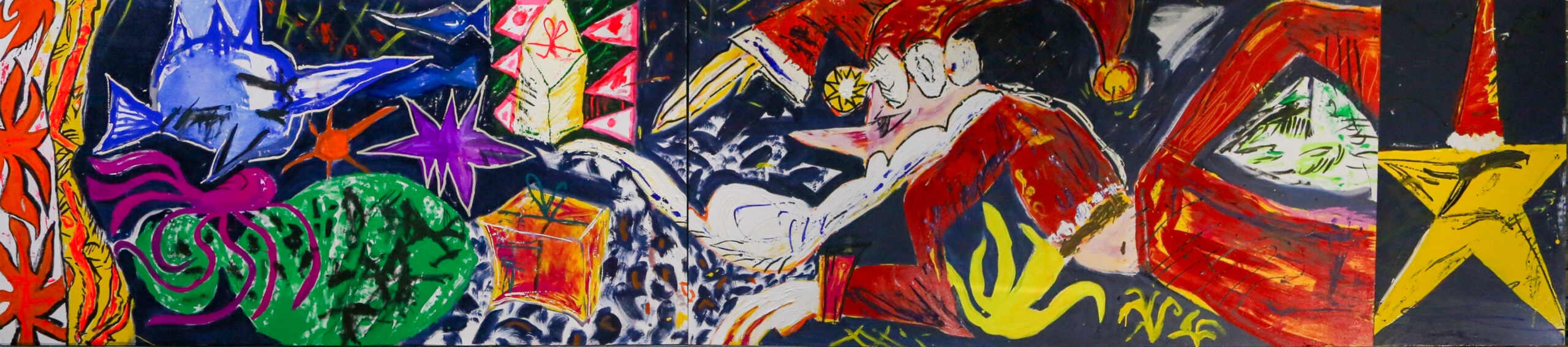 「みんなのクリスマス、12月25日はみんなにやってくる――遠い海の向こう、深海のクジラや魚たち、森の動物たち(ネコも!)、南極のペンギンにシロクマ、太古昔の恐竜たちにも、童話の世界にも、プレゼントを配達だ!トナカイたちもがんばるぜ!雪だるまさん溶けないで!寝坊助サンタも許してあげて、キミのもとへも届けるよ。野原で少し休憩しても優しい雪が降って起こしてくれる。寒いけどへっちゃら!星降る夜空に、上野へサンタとみんなで集合だ!!送りものが遅れて渡しても、サンタは優しく見守ってくれる。今回の作品を通じて、みんなで心を温めよう」