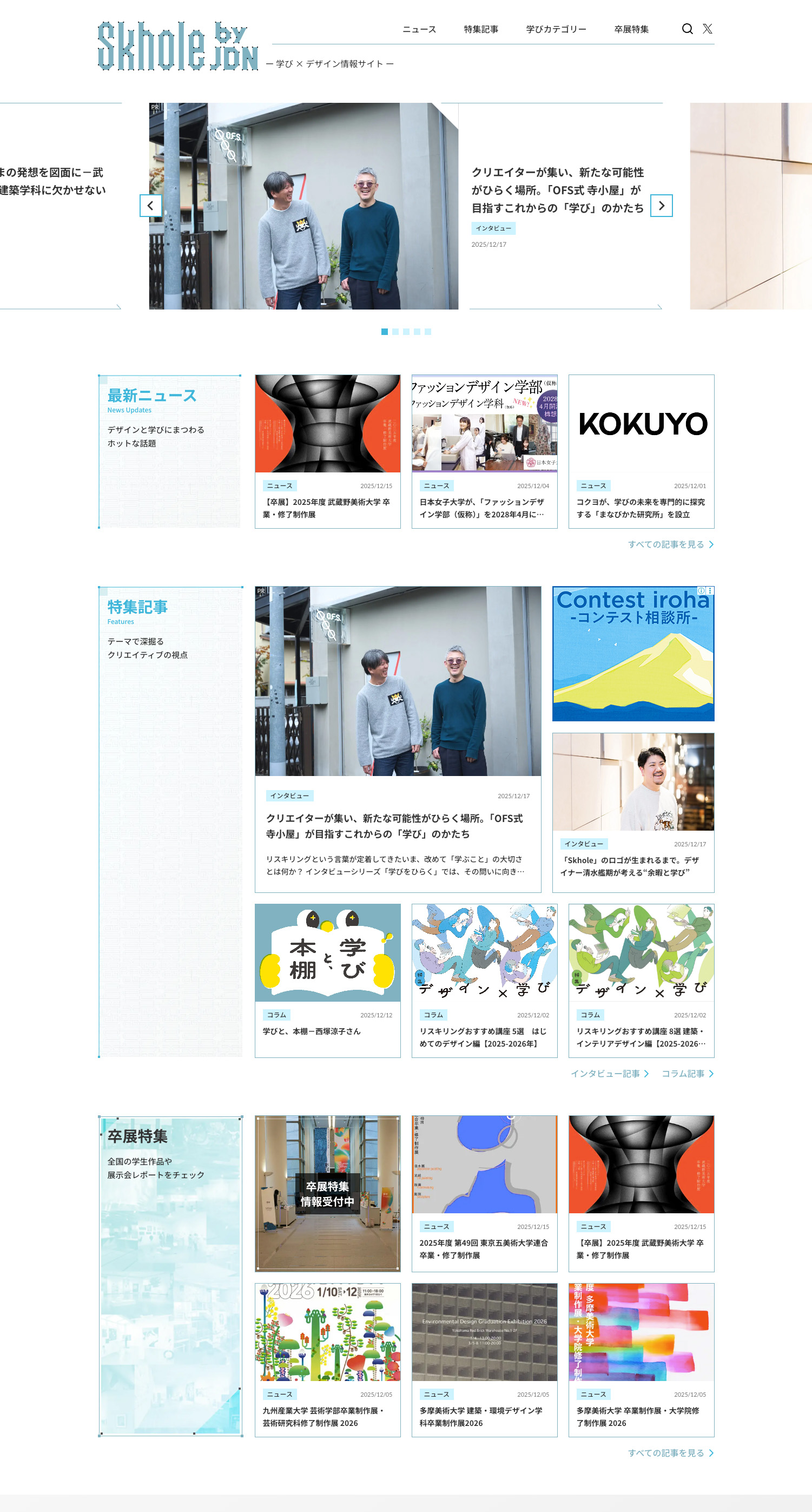 また、これまでU18層を対象にデザイン・クリエイティブ関連の学校情報を発信してきた「デザインノトビラ」が、2025年12月でサービスを終了します。同サイトの人気企画であり、大学や専門学校等の卒業制作展の様子をアーカイブ的に紹介してきた「卒展特集」は、「Skhole by JDN」に移行し、今後も掲載を続けます。