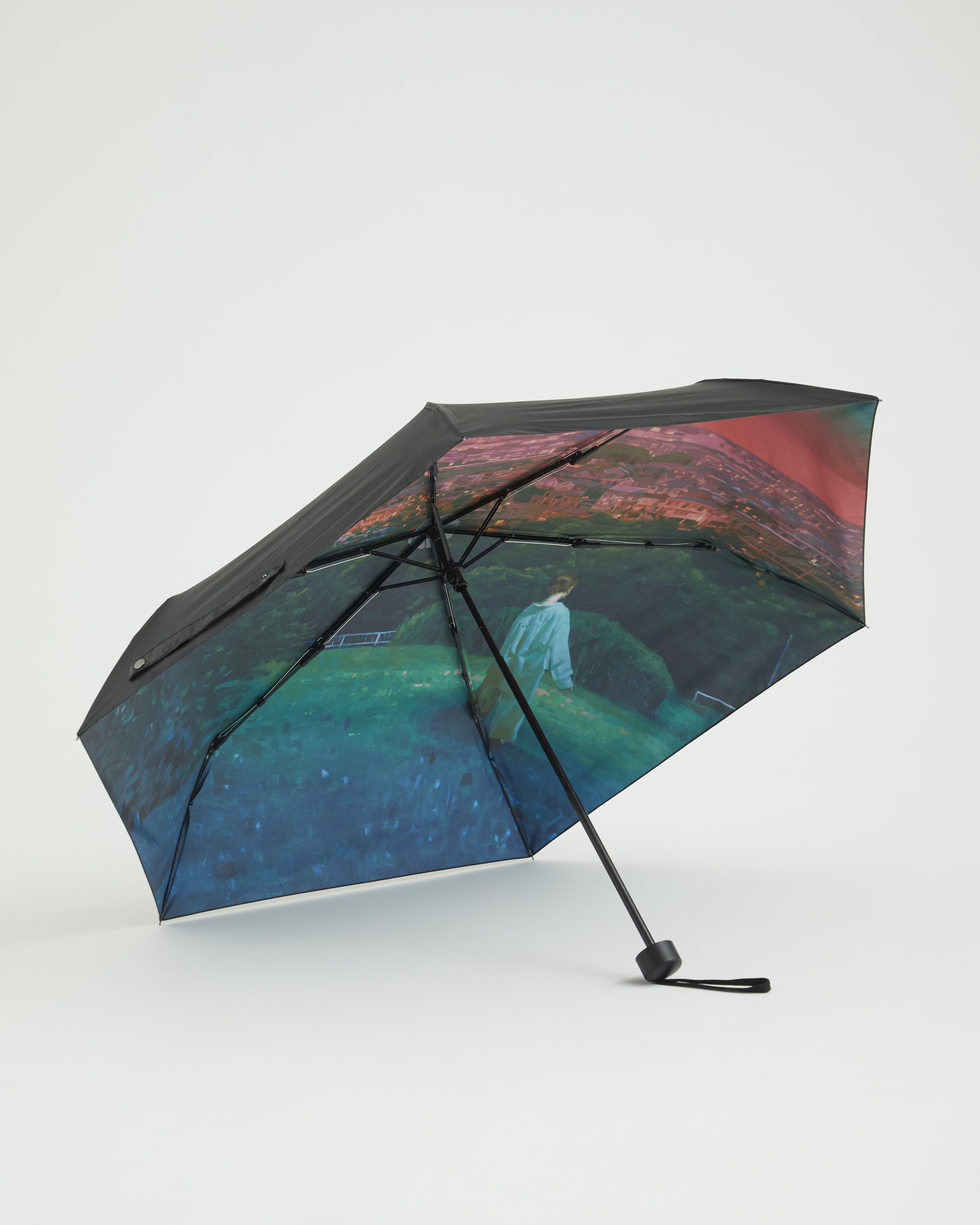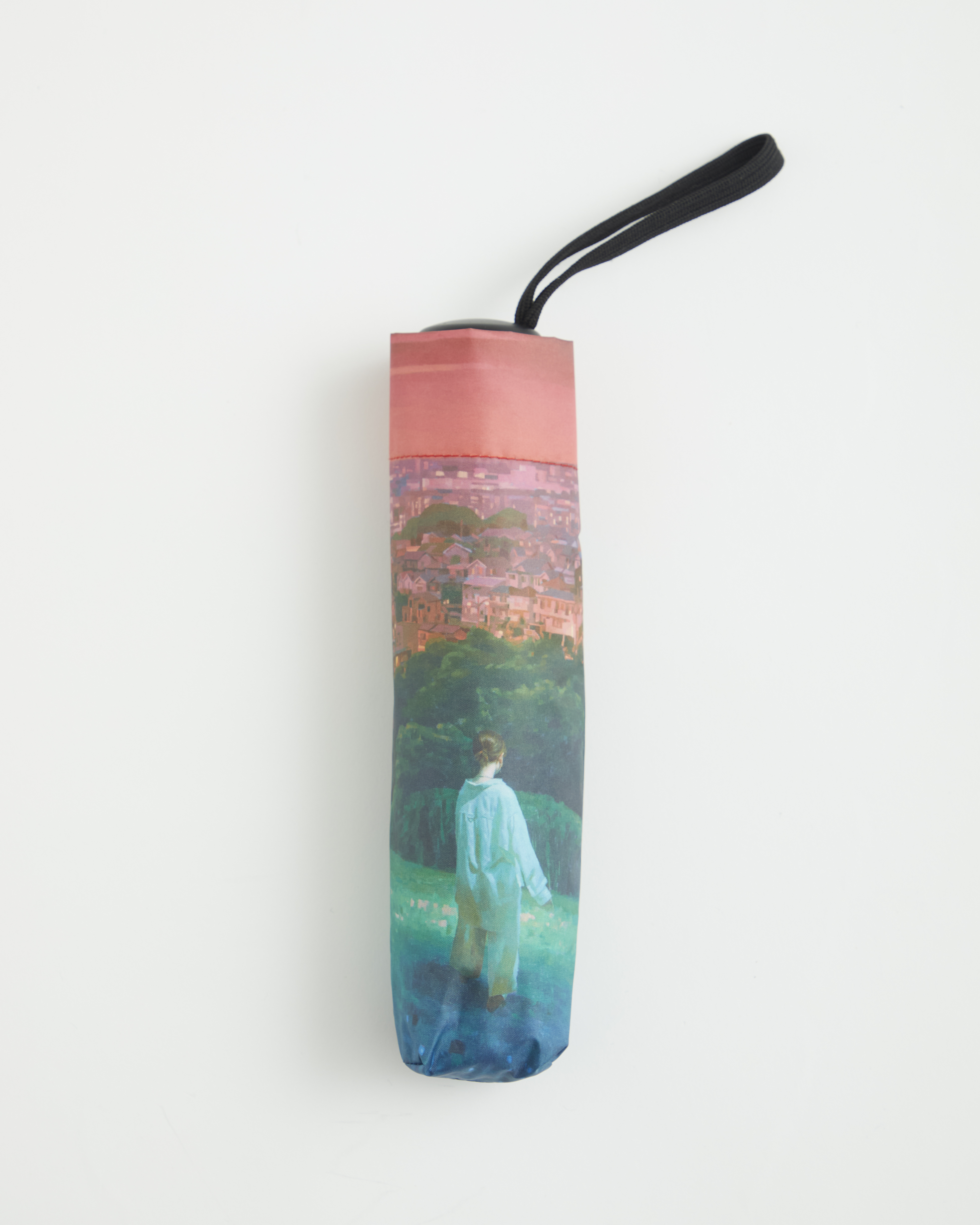 傘の内側に作品を大胆にプリント。傘袋にも同様のデザインを施し、雨の日もアートを楽しめる仕様にしました。