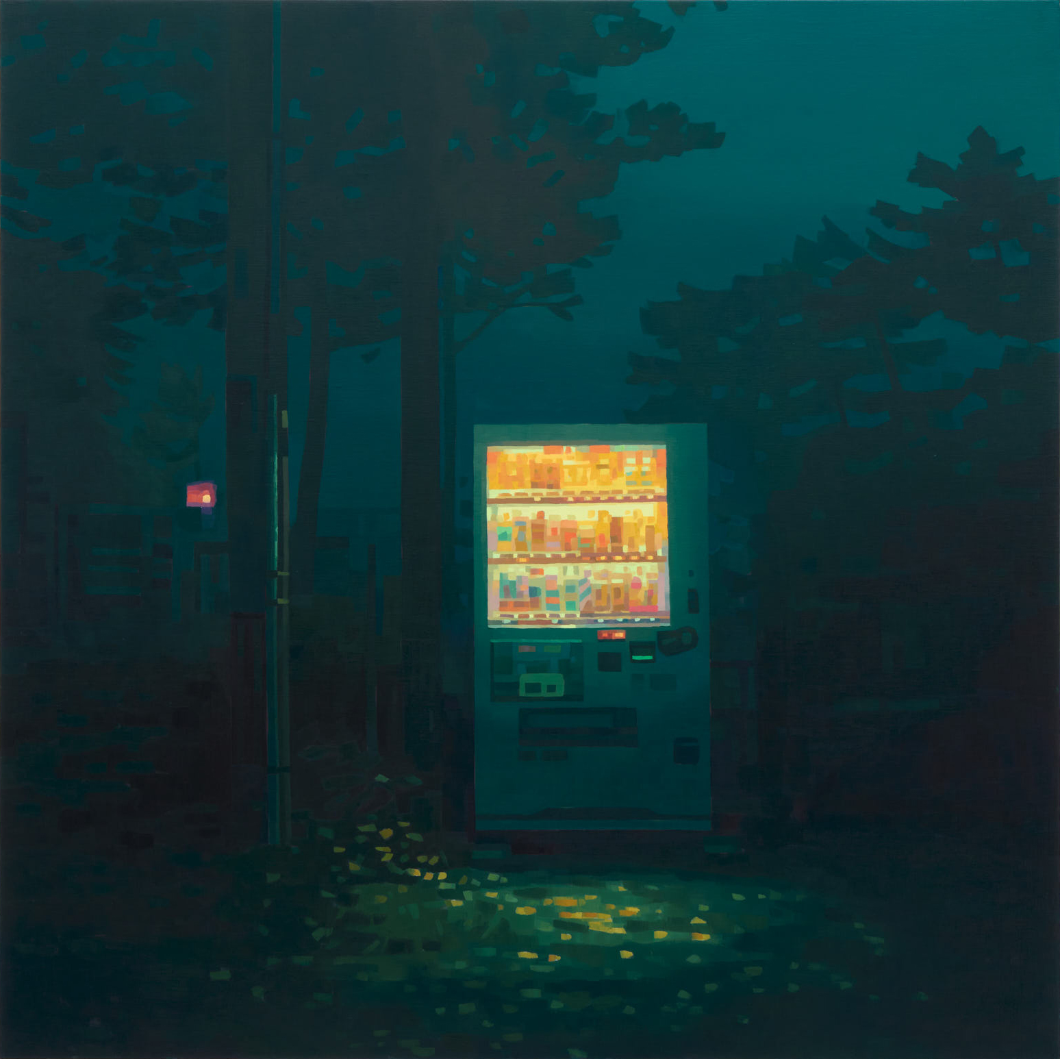本展では、ペインティングに加え、森本が初めて挑戦するインスタレーションを展示します。暗闇にぽつりと灯る自販機と、そこに佇む人。森本絵画の世界を現実世界に拡張したような展示空間で、没入的な鑑賞体験をぜひお楽しみください。