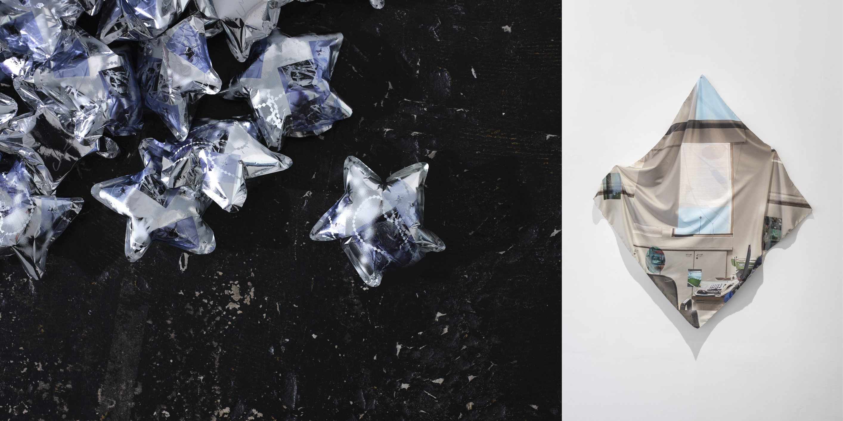 近年の制作では、『壁紙』というキーワードに引っかかり、ハンカチやバルーンといった既製品のボディをお借りしながら、主体・支持体と背景の関係性にどんどん着目。バルーンに少しだけ空気を入れて膨らませることや、風が作品をわずかに揺らすような、流動的で不安定な状態。日常の断片や秩序を少しぶらせつつ、プリントとリアルの差異を弄ぶように印刷することで、複製のあいだに生まれる“ズレ”を、ポジティブな揺らぎとして受けとめている。