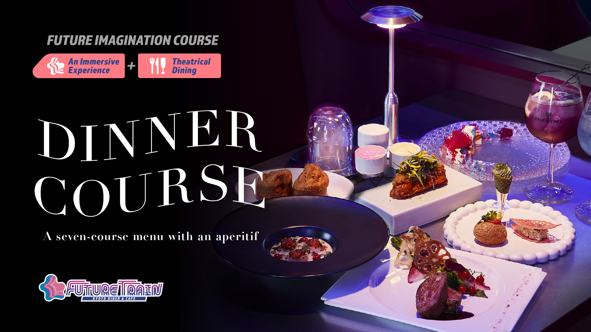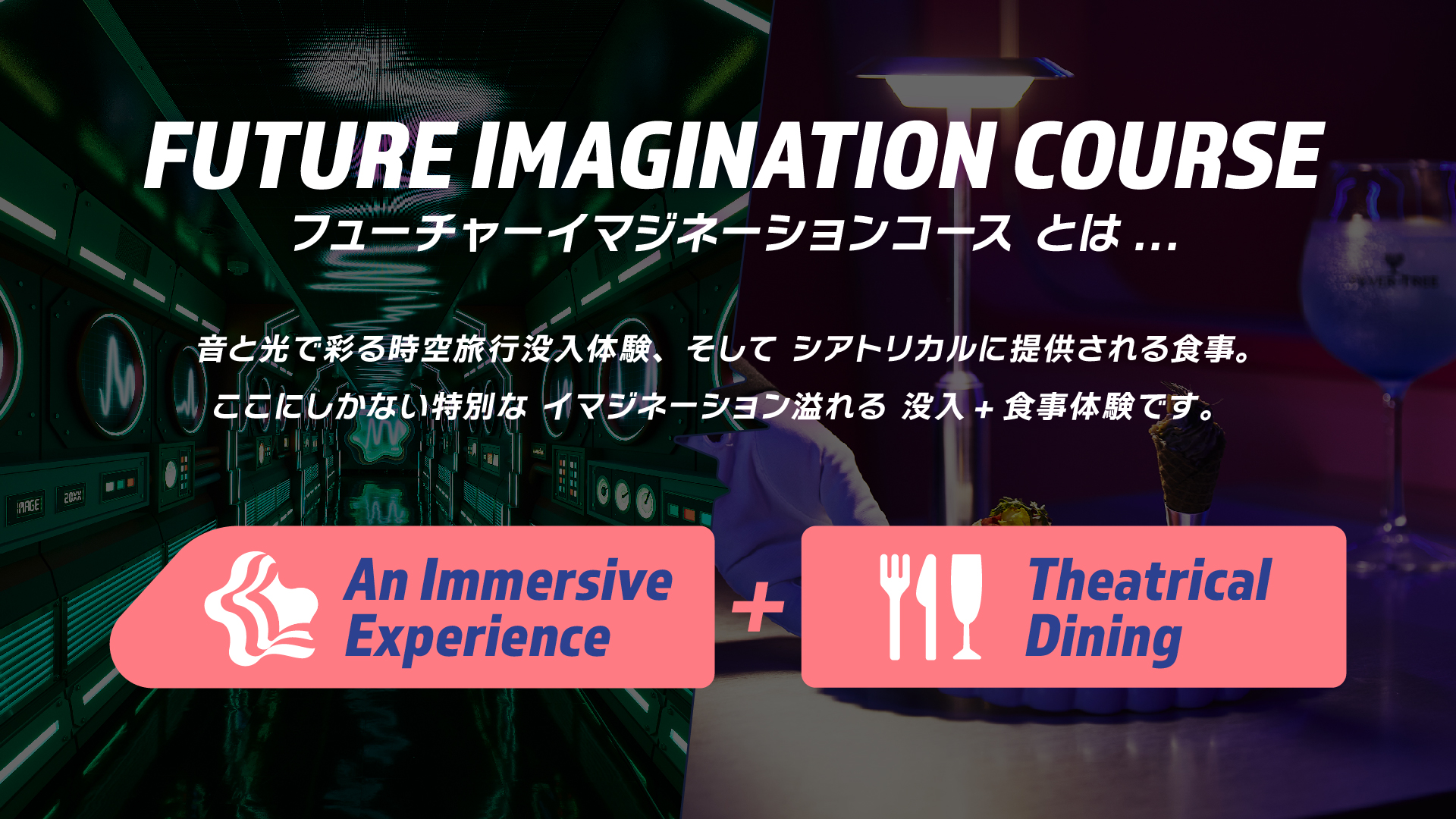 「FUTURE IMAGINATION COURSE」は、この先頭車両での”時空旅行”の没入体験と、食堂車をオマージュした2号車で、旅した各世界とリンクしたお食事を楽しめる「FUTURE TRAIN」オリジナルのシグニチャーコースです。